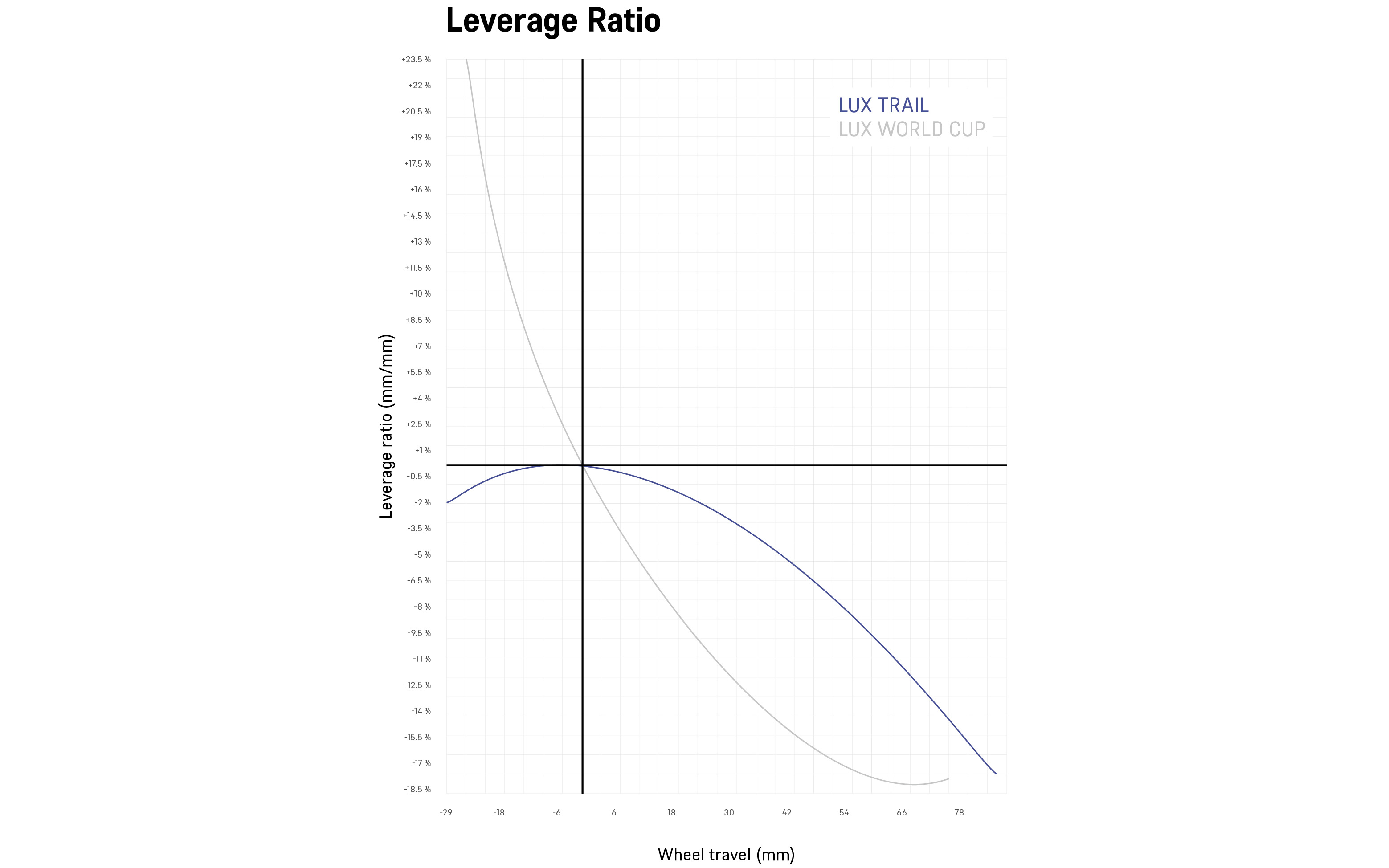 Avec ce graphique relatif au ratio de levier (cf. MTB Anatomy : l’amortisseur, second volet), Canyon veut montrer la sensibilité sur le début de course, et la réactivité sur la seconde moitié du débattement.