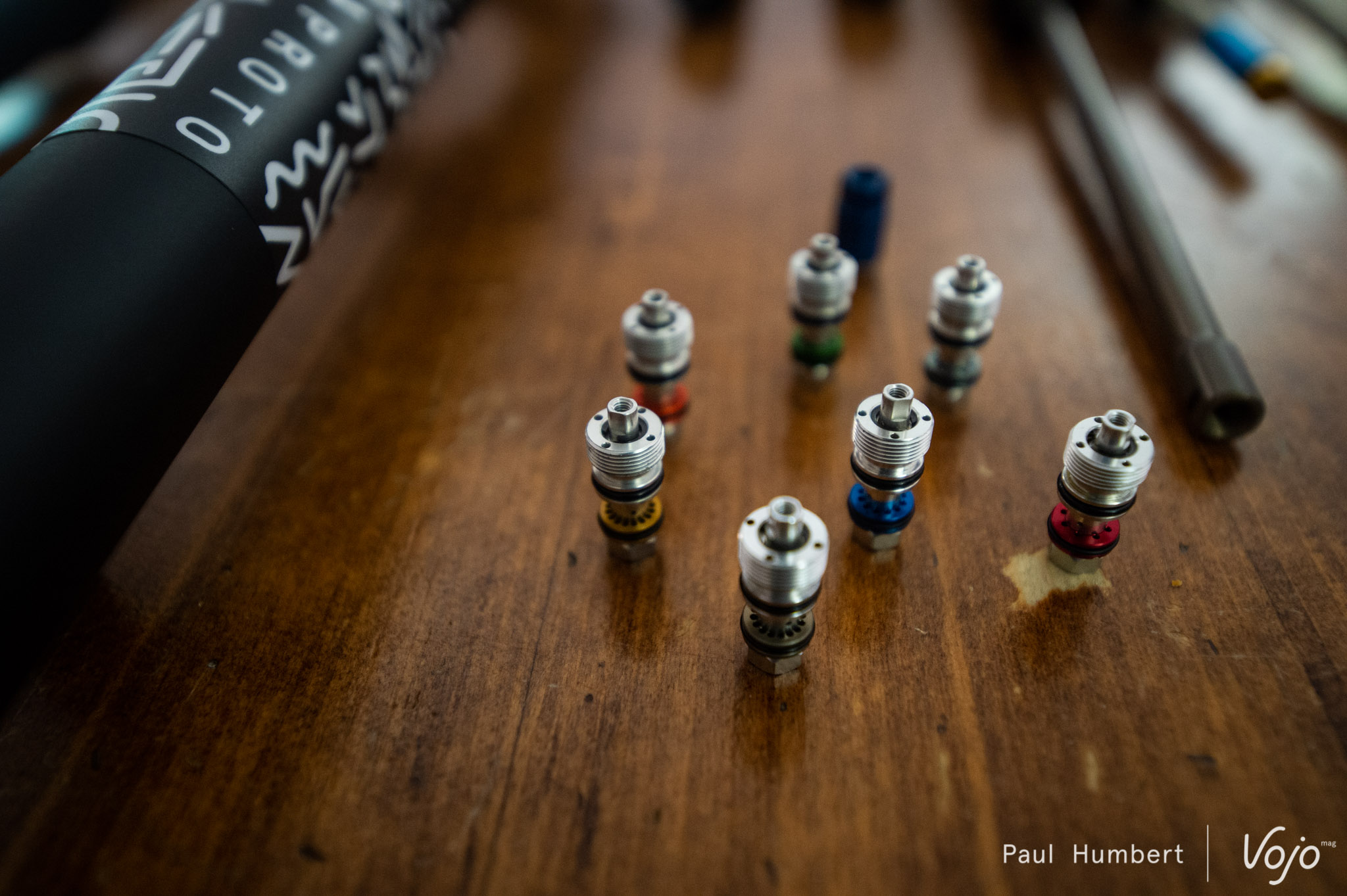 Comme pour les autres fourches du catalogue de la marque, le comportement de la cartouche peut être affiné à l’aide des CTS (pour « Compression Tuning System »). Ces petites « capsules » facilement interchangeables dotées de trous différents permettent d’adapter la façon dont le flux d’huile circule dans la fourche. Ce sont ainsi sept CTS différents qui sont proposés par Formula afin d’obtenir des courbes de compressions adaptées aux préférences, poids et au niveau de chacun.