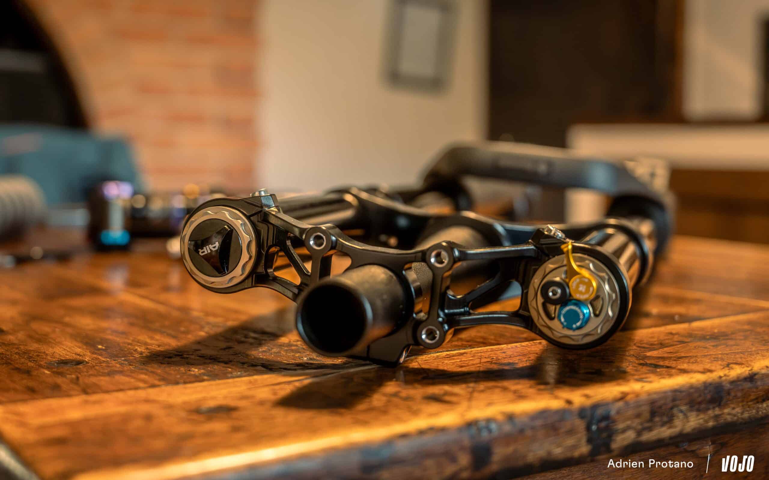 Pour cette nouvelle fourche à double té, Formula a pu profiter de l’expérience et des apprentissages engrangés sur la Selva. La cartouche utilise ainsi un design similaire à celui de la Selva, uniquement ajusté pour le châssis à double té. À son sommet, on retrouve une molette de réglage de la compression basse vitesse, un réglage externe du rebond et un levier de blocage. La fermeté de ce blocage peut-être réglé à l’aide d’un petit outil.