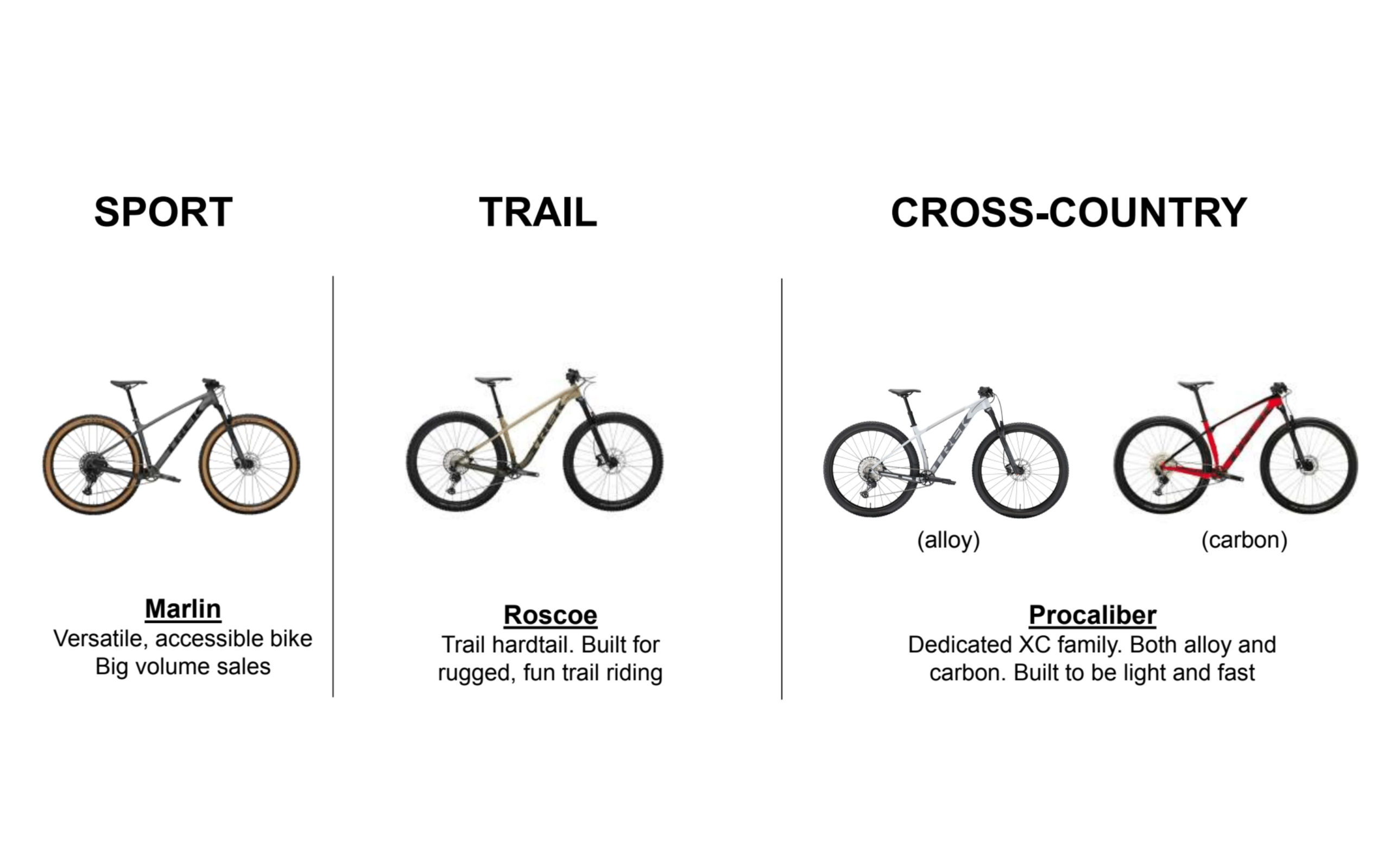 Jusqu’à présent, la gamme des semi-rigides de chez Trek était composée de 4 modèles, dont 3 en aluminium : le Marlin, modèle accessible et porte d’entrée dans le monde du VTT, le Roscoe davantage destiné au trail, et une catégorie cross-country partagée entre le X-Caliber, modèle aluminium accessible, et le Procaliber, modèle carbone davantage tourné vers la performance.