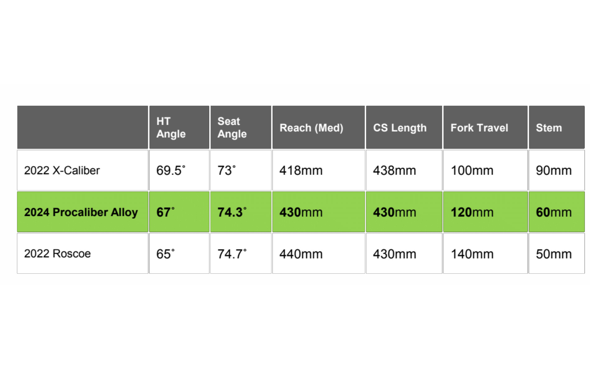 Comme on peut le voir sur ce tableau comparatif, la géométrie de ce Procaliber aluminium se détache donc du X-Caliber pour se rapprocher davantage des cotes que l’on retrouve sur le Roscoe.