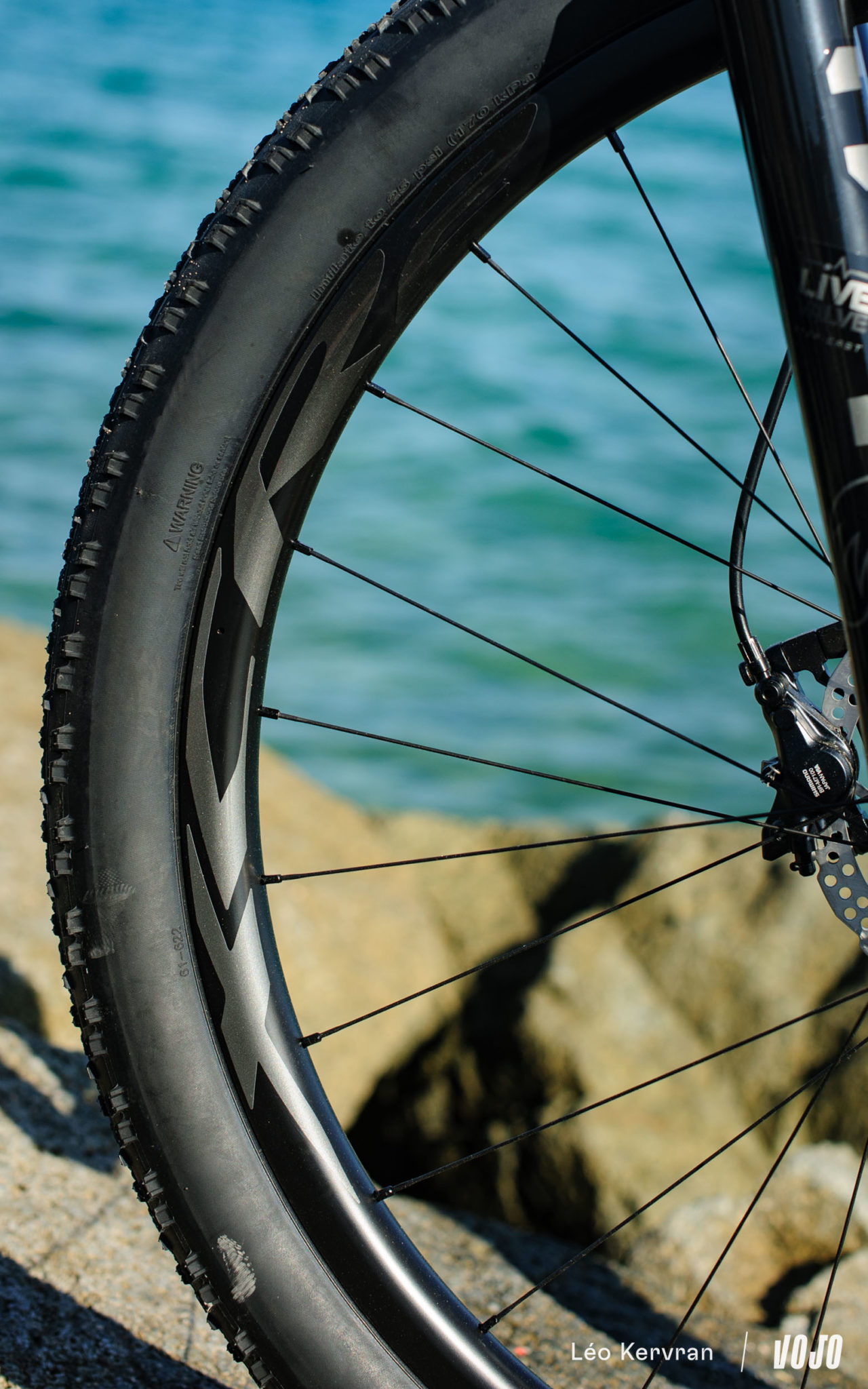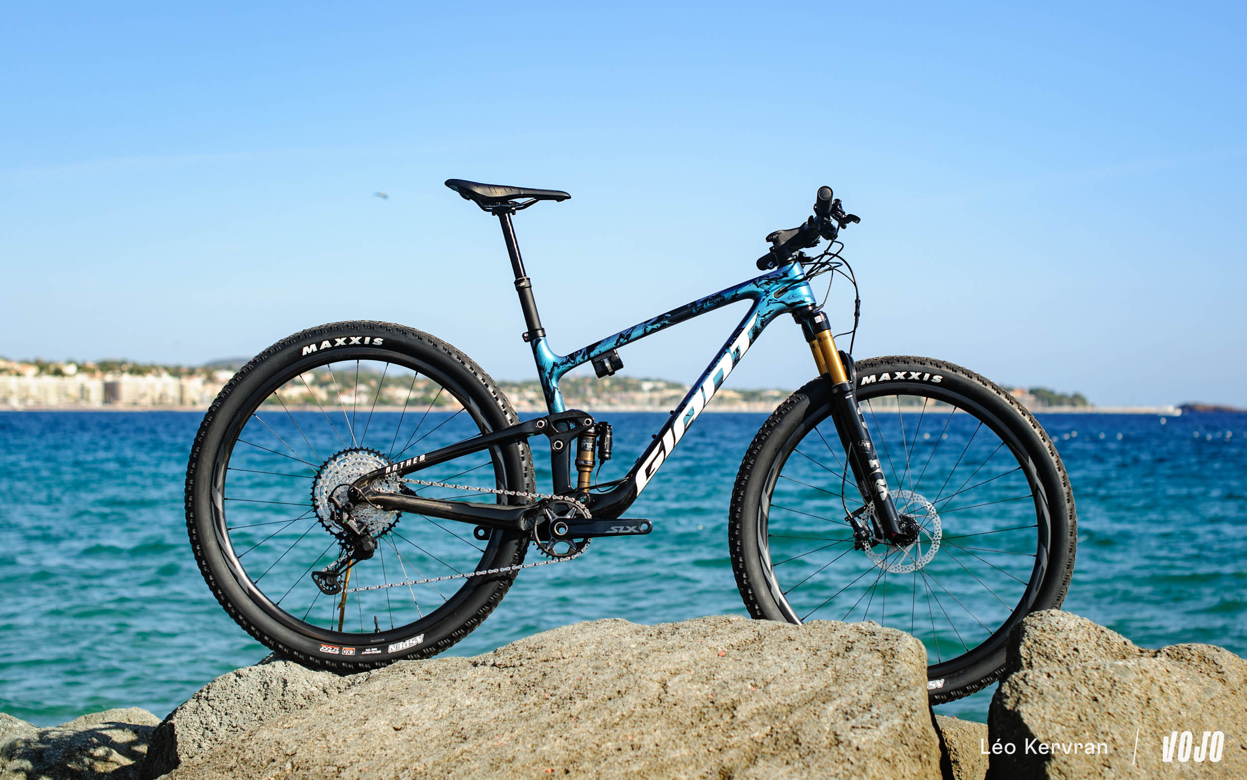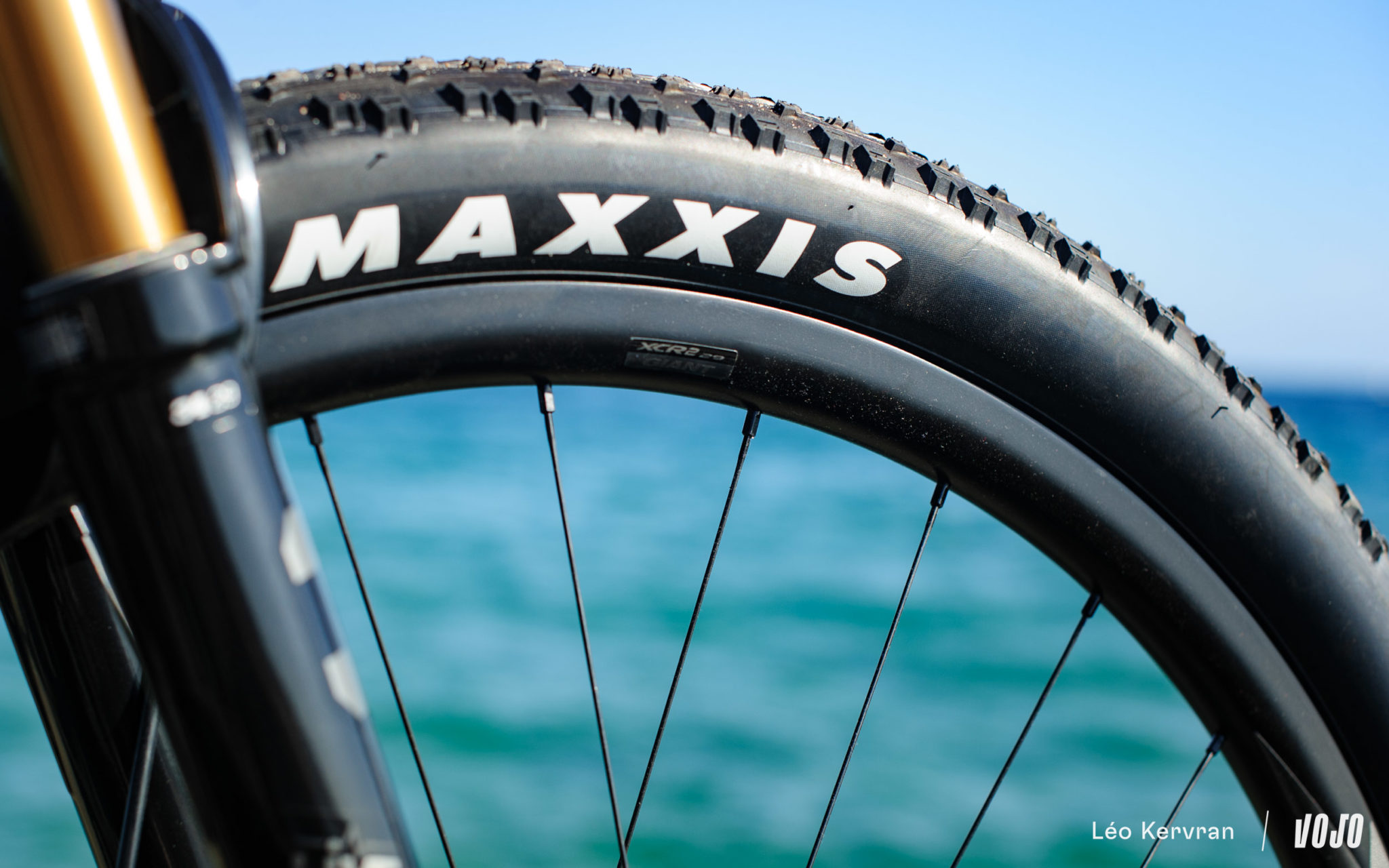 Côté roues, on a droit à du carbone avec des Giant XCR-2 (25 mm de largeur interne, 1639 g la paire). Ce modèle repose sur les mêmes jantes que les XCR-1 plus haut de gamme mais l’utilisation de moyeux et d’un rayonnage plus simples permet de faire descendre un peu le prix… contre une petite pénalité en poids et en dynamisme, forcément. Elles sont chaussées de pneus Maxxis Aspen Exo 2.4, très populaires en coupe du monde.