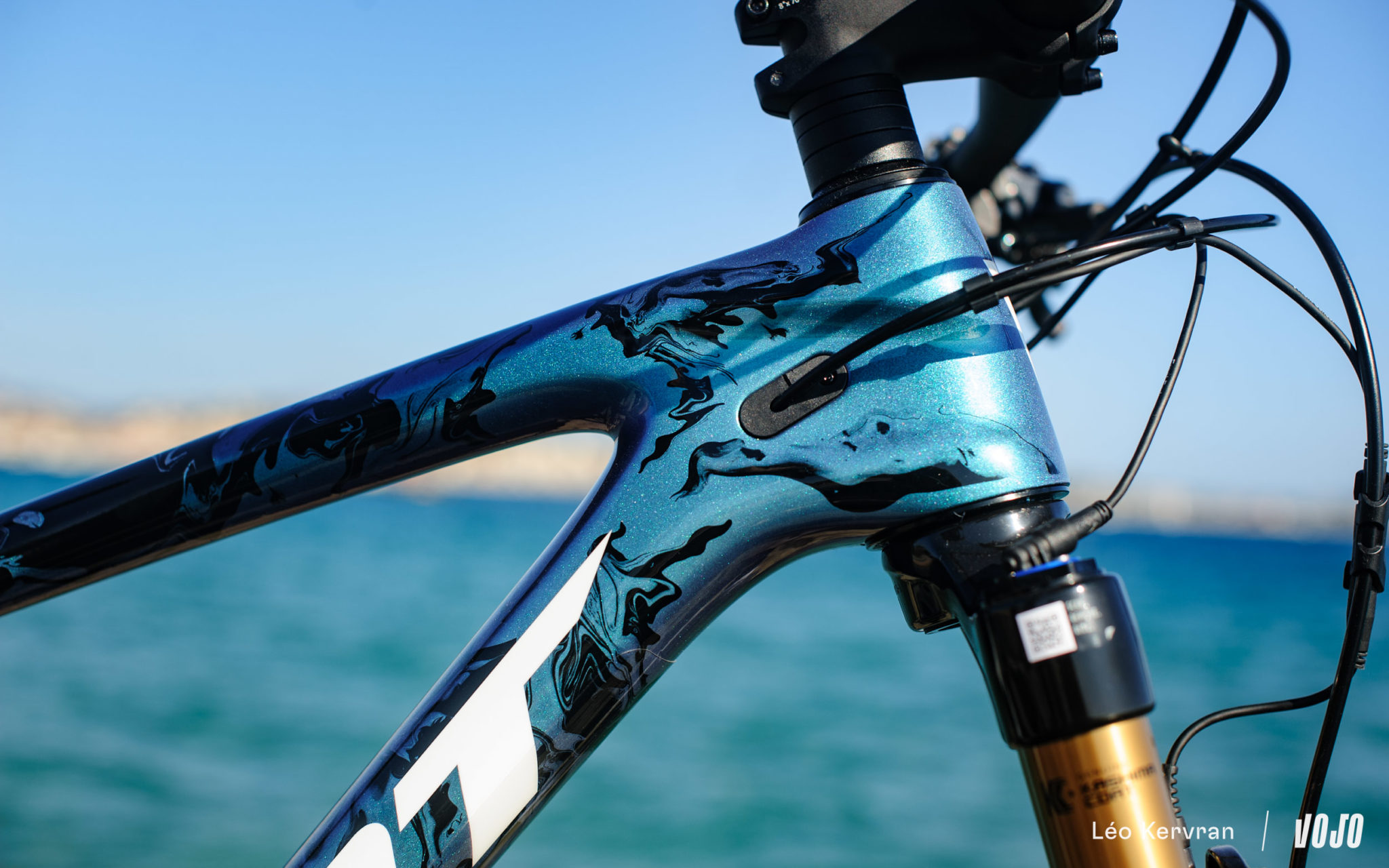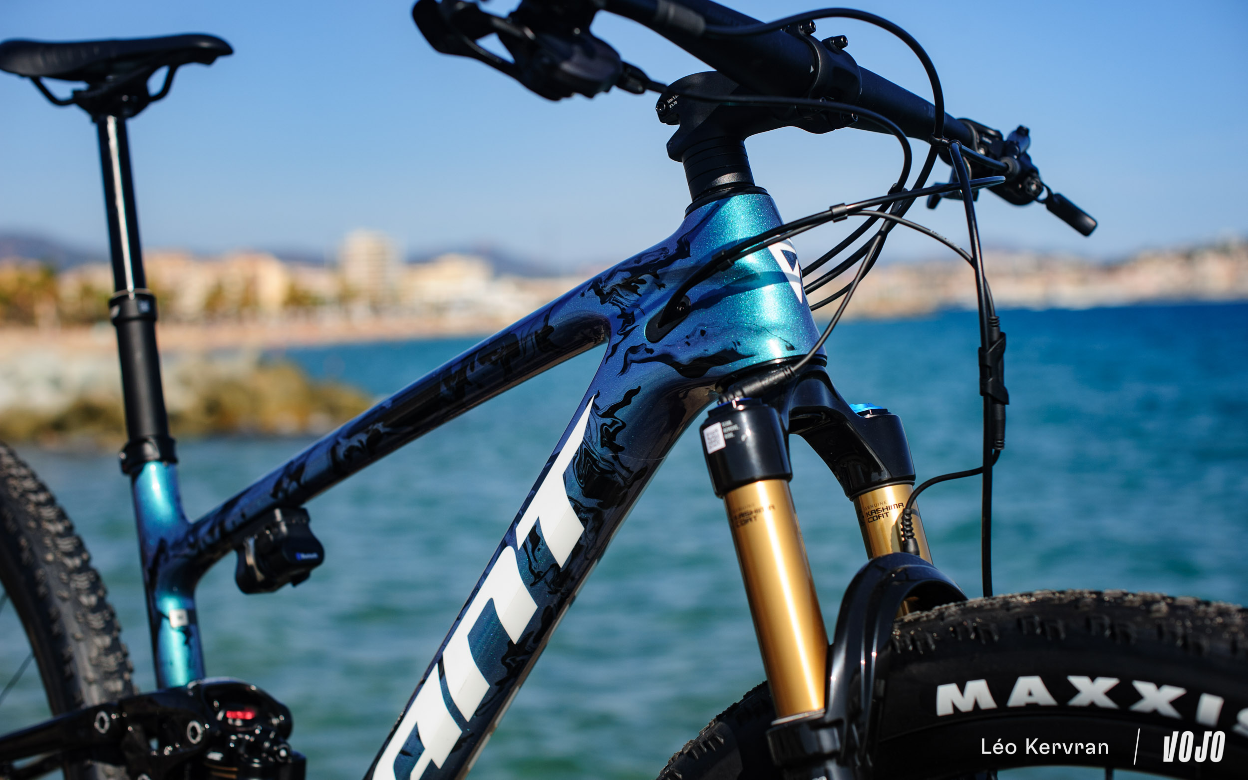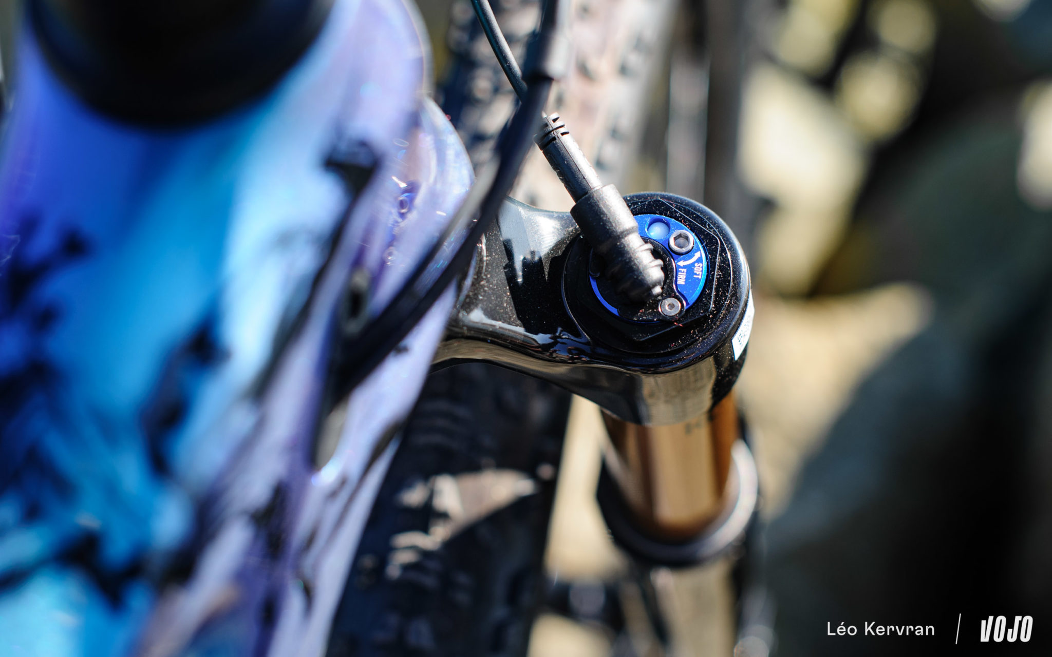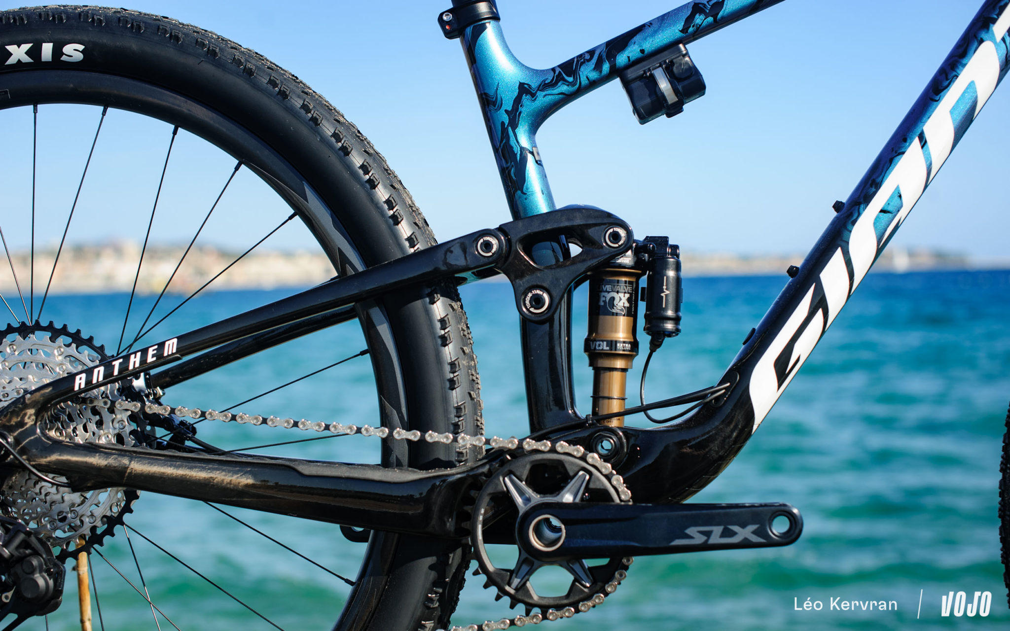 Qu’est-ce qui compte le plus en XC ? Le train roulant et les suspensions, bien sûr. Le vélo profite donc d’un système complet Fox Live Valve, habituellement réservé à des machines qui tutoient ou dépassent les 10 000 €. Il est ici monté sur une Fox 34 SC à l’avant et un Float DPS à l’arrière, et on rappelle qu’il dispose de cinq modes pour adapter sa réactivité et son comportement à ses préférences et au terrain : très technique, très roulant ou entre les deux.