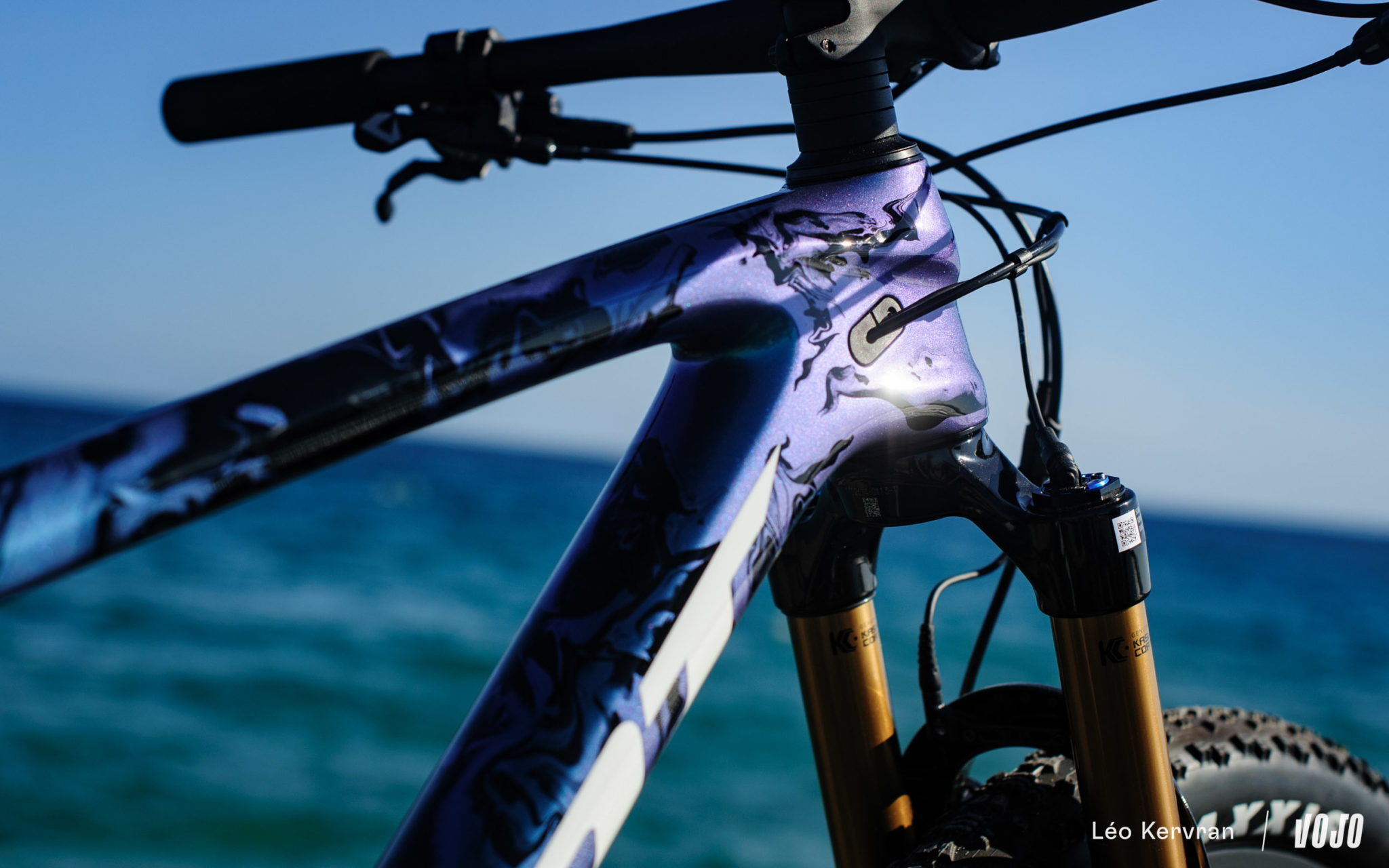 Enfin, impossible de ne pas glisser un mot sur la finition. Unique, elle varie entre le violet, le bleu et le turquoise selon l’angle avec lequel on la regarde, et scintille littéralement au soleil. Interrogée sur le processus qui permet d’obtenir ces belles vagues noires (il ne s’agit pas d’un bain dans lequel on trempe le cadre), Giant est resté vague dans ses explications mais assure que chaque cadre sera différent à ce niveau.