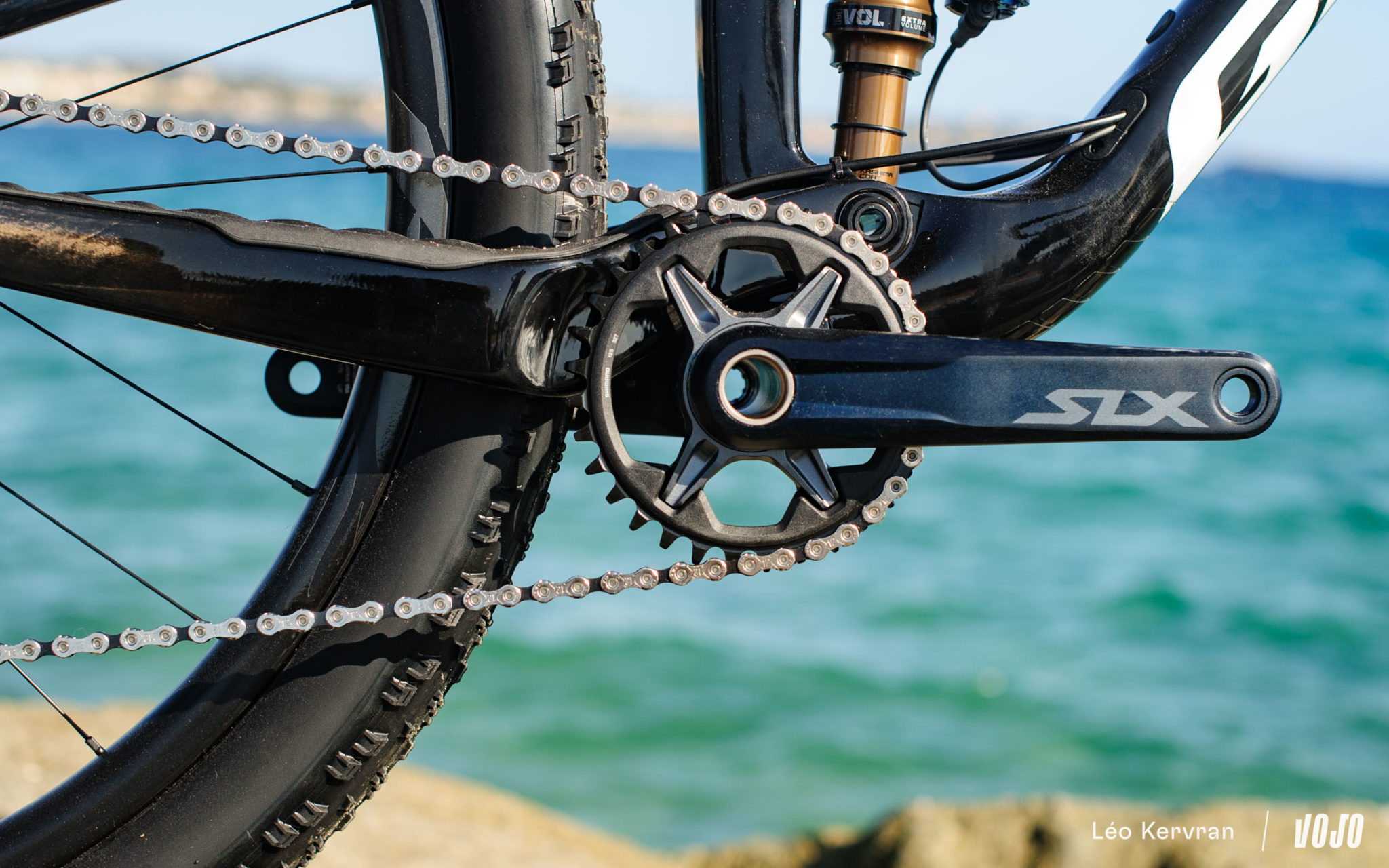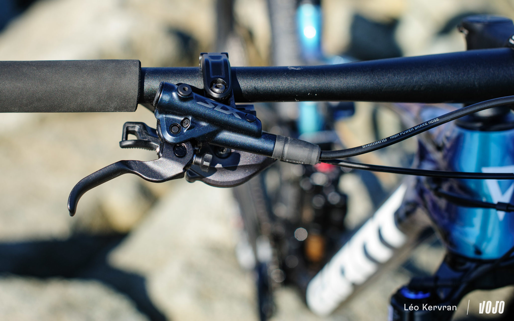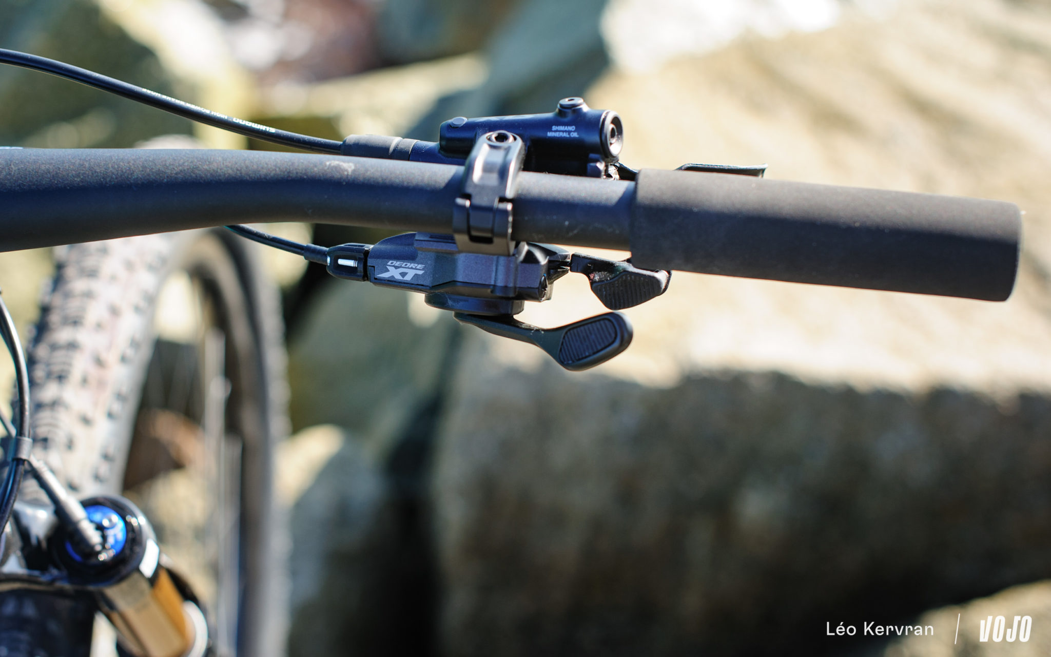 Sans avoir été « sacrifié », le reste des équipements est plus simple. Ainsi, la transmission mêle Shimano Deore XT (dérailleur et surtout manette, un choix judicieux) et SLX (cassette, pédalier) et c’est encore du Shimano SLX pour les freins, en deux pistons. On pourra néanmoins regretter les disques SM-RT56, plusieurs niveaux de gamme en dessous des derniers SLX.