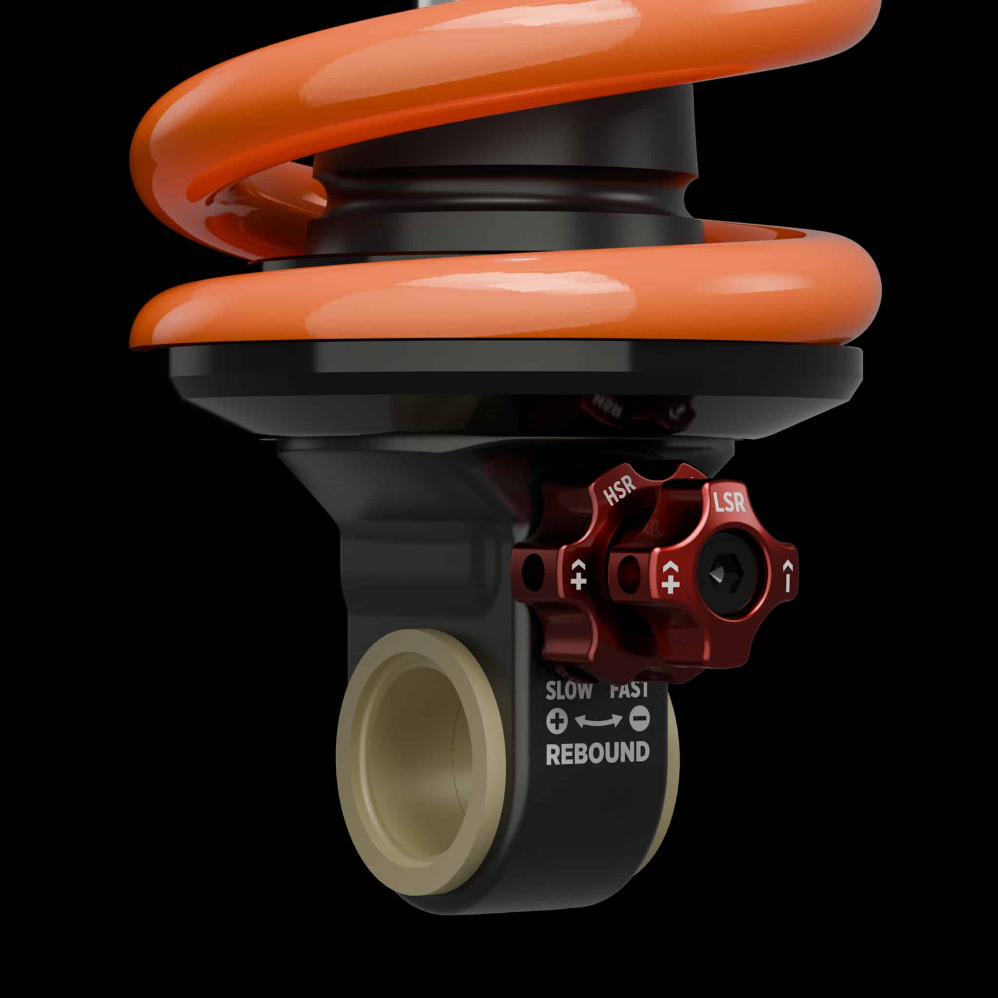 La première évolution notoire est la choix d’une construction mono-tube pour les amortisseurs. On retrouvera toujours 4 réglages (Compression hautes et basses vitesses. Rebond hautes et basses vitesses).