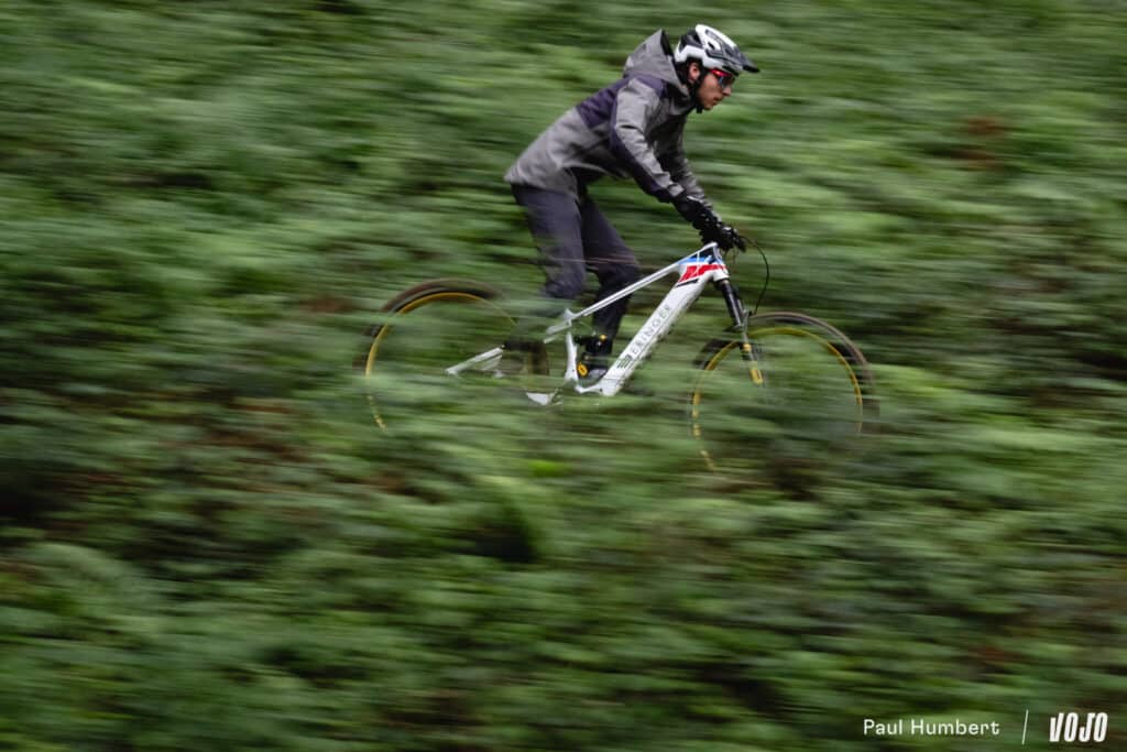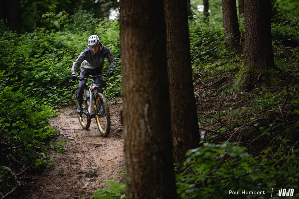 Attention, même si le BR-01 est bien posé au sol, il n’est pas pour autant un chasseur de chrono, ni un enduro ! Il ne faudra pas s’engager sur des sections trop cassantes ou hors programme, auquel cas la suspension arrière (140 mm seulement, rappelons-le), l’angle de direction à 65,5° (bien plus droit que sur un enduro) et la souplesse de l’ensemble dans les gros appuis vous feront vite sentir les limites du vélo.