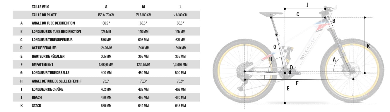 En parlant de taille, voici le tableau de géométrie. Parmi les valeurs clé, on repère un reach de 450 mm en taille M, des bases de 462 mm, un boîtier de pédalier à – 24 mm, un angle de direction à 66,5° et un angle de tube de selle à 73,5°. Si les distances sont en phase avec les VTTAE moderne, les angles nous laissent beaucoup plus circonspects. Heureusement, nous devrions avoir l’occasion de monter sur le vélo dans les prochaines semaines, ce qui nous permettra de mettre nos théories à l’épreuve et de vous faire part de notre ressenti sur les sentiers.