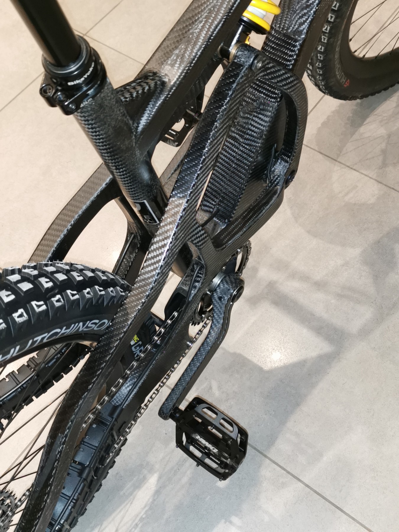 Côté suspension, le cadre reprend une solution très simple et connue mais l’adapte de façon originale. Il s’agit donc d’un monopivot en prise directe mais avec un point de pivot placé très loin vers l’avant, une bonne quinzaine de centimètre devant l’axe du pédalier. Pour rejoindre le pédalier, la chaîne traverse littéralement la base qui fait donc office de guide-chaîne.