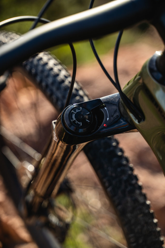 La principale nouveauté de ce montage, c’est elle : la Lefty Ocho, ici en… 120 mm de débattement et avec blocage au té. Depuis la sortie en 2018 de cette version à simple té de la célèbre fourche monobras, c’est la première fois qu’un modèle dépasse les 100 mm de débattement. Annoncée à 1 550 g, ce qui la place au niveau de la dernière Sid 120 Ultimate (lire notre essai), elle sera disponible à l’achat cet été au prix de 1 599 €.