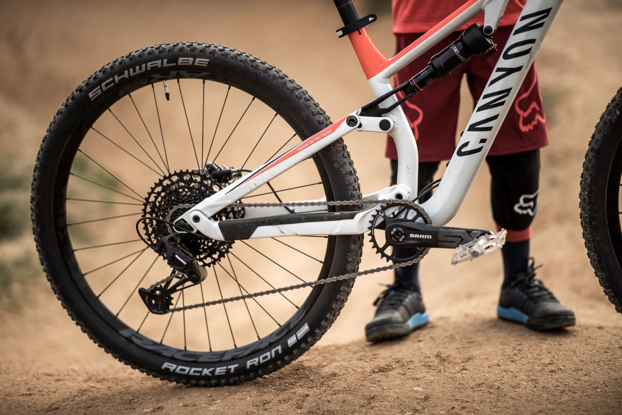 Le vélo est en revanche vendu avec une tige de selle rigide classique, pour pouvoir la recouper si besoin. Côté transmission, c’est une Sram SX Eagle avec plateau en 30 dents (et manivelles en 165 mm) qui prend la place de la transmission Shimano SLX/XT du Neuron AL 6.0. Le train roulant est aussi simplifié et allégé, la version Young Hero se passant de la jante en 30 mm à l’avant et utilisant des pneus un peu plus fins.