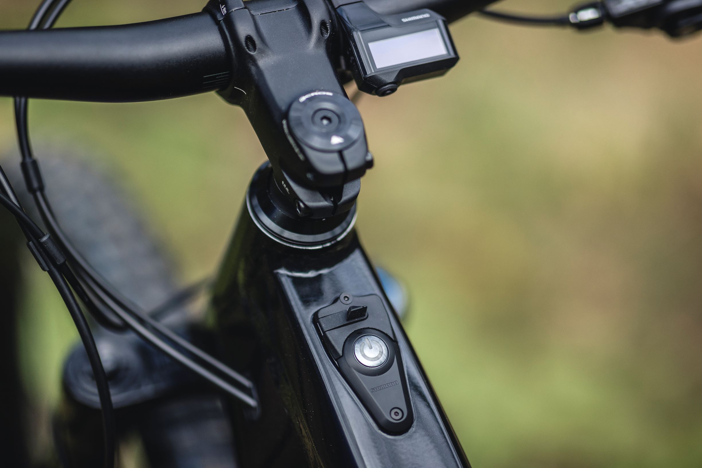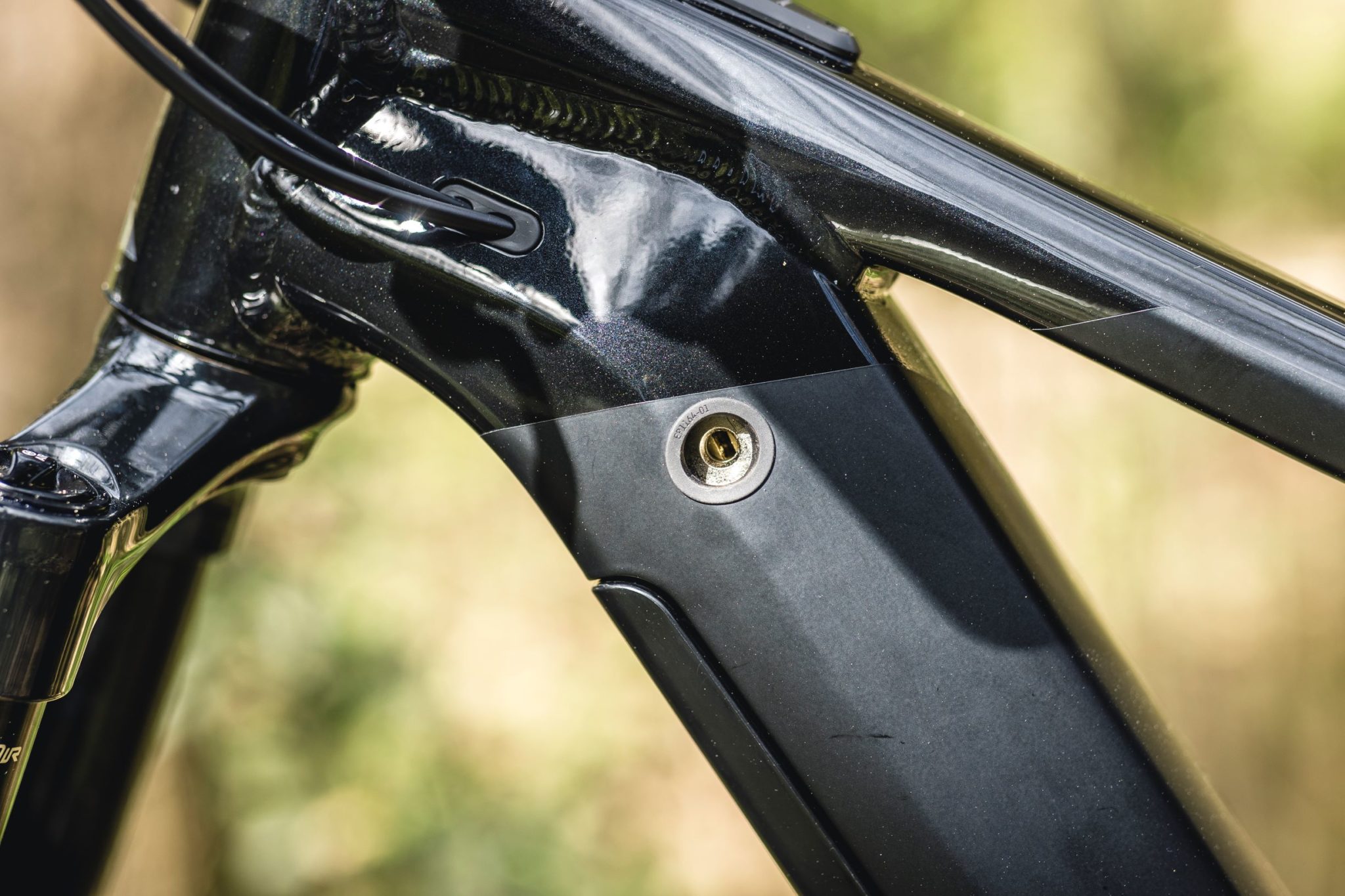 Une clé est nécessaire pour déverrouiller la batterie et une fois cette dernière enlevée, on a accès à toute la câblerie qui passe en interne dans le tube diagonal. A ce propos, on remarque d’ailleurs que Canyon a développé un cintre et une potence spéciaux pour faire passer la connectivité électrique de la commande à l’unité centrale en interne et épurer le poste de pilotage.