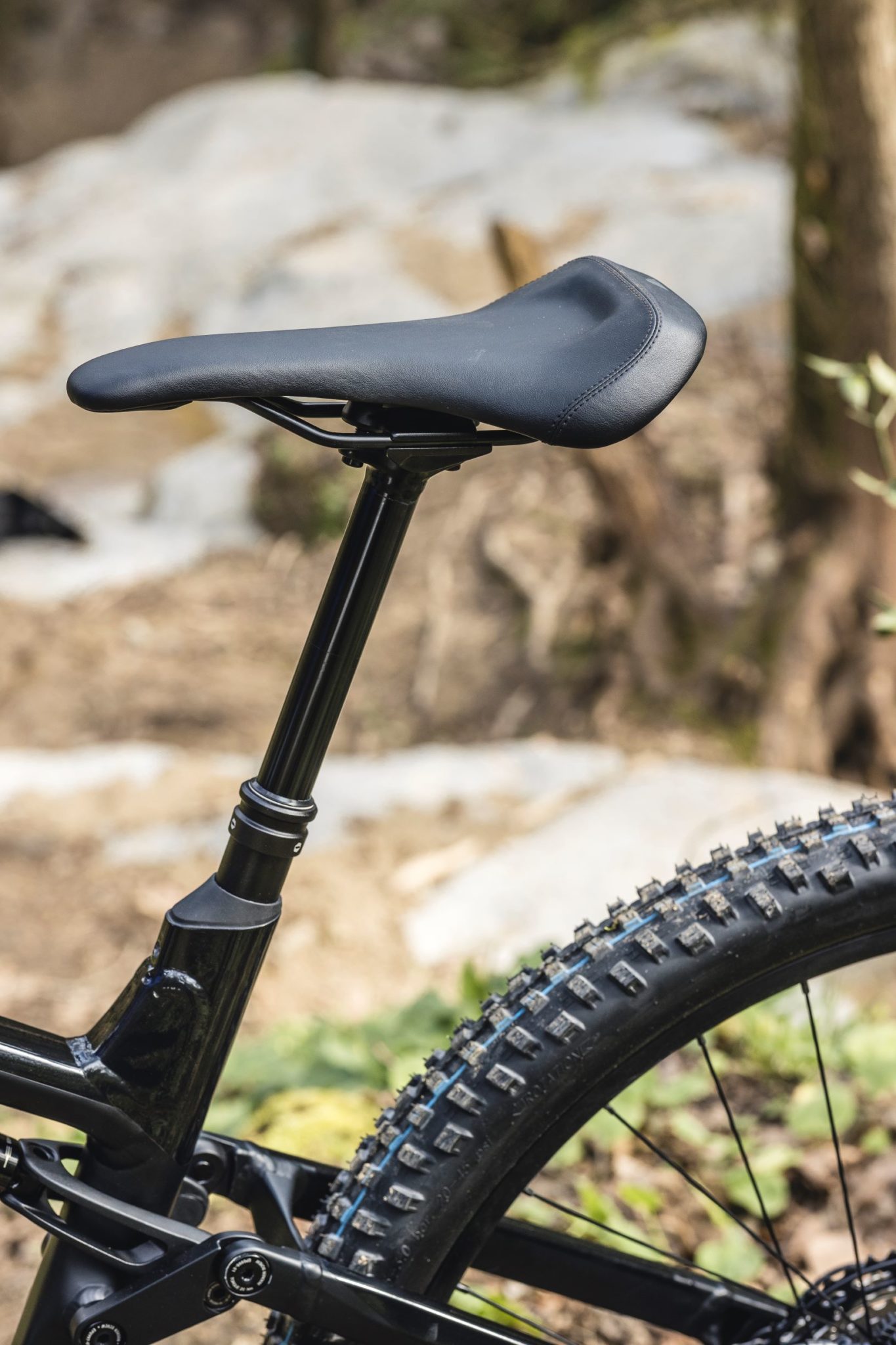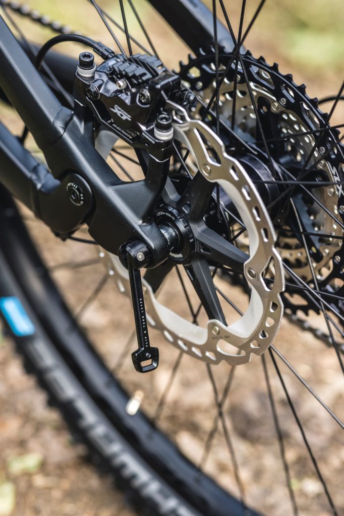 Enfin, du côté des petits détails, on remarque une prise USB-C sur le tube supérieur pour recharger un téléphone, brancher une lampe ou un GPS. Le collier de serrage des poignées est intégré à leur châssis et ne dépasse pas, pour faciliter l’accès à la commande de l’assistance tandis que la selle est un modèle Ergon spécifique e-bike, avec un arrière particulièrement relevé pour offrir un peu plus de support que sur un modèle classique. Le guide-chaîne est joliment fixé sur le point de pivot principal de la suspension et on retrouve le très pratique axe de roue arrière Canyon, avec son levier qui se range dans l’axe lorsqu’on roule.