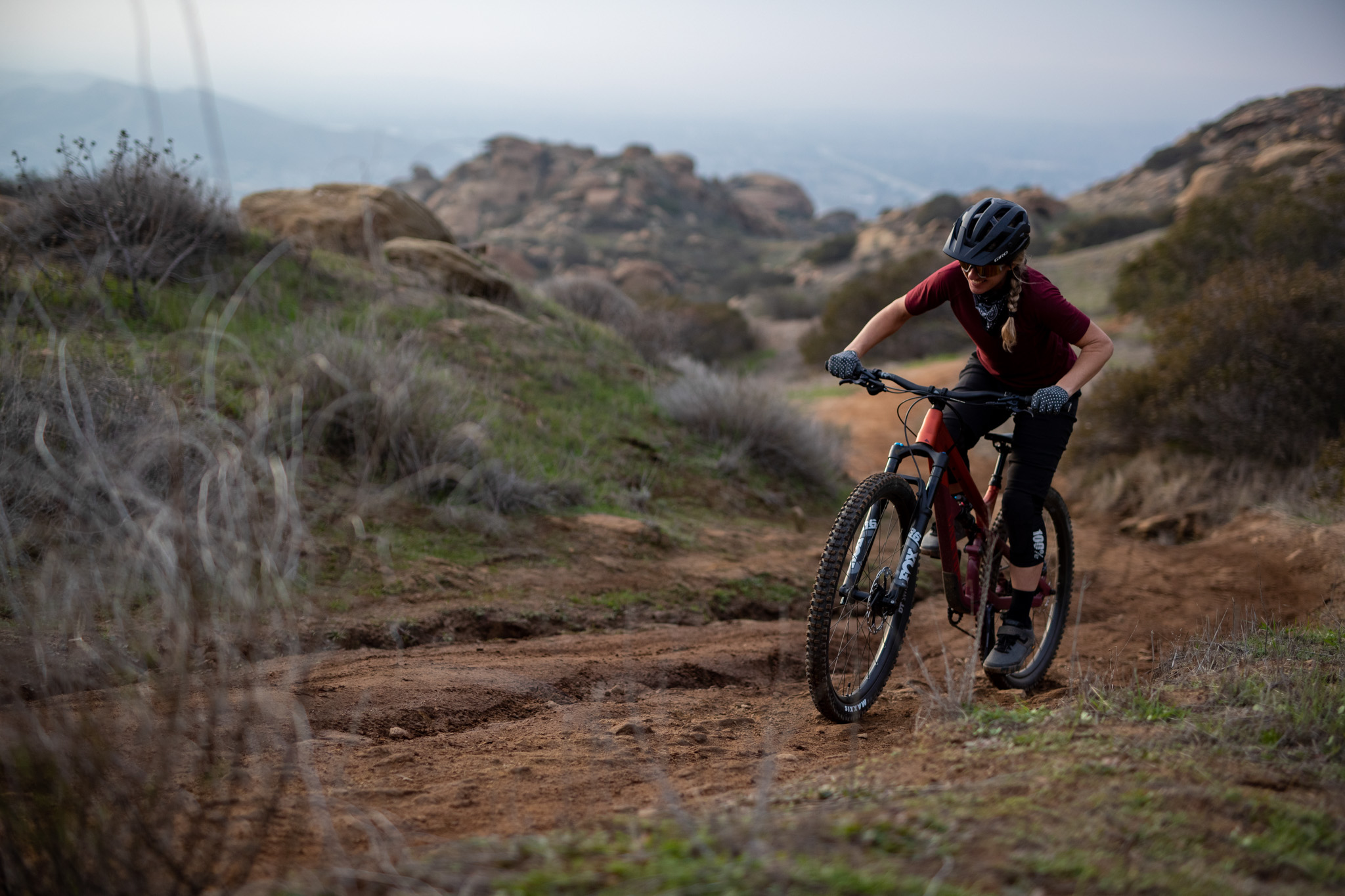 La suspension offre également un visage similaire à celle du Spectral, de façon à offrir le même comportement joueur. Un peu moins progressive au total à cause du plus petit débattement et basée sur des ratios un peu plus faibles, elle compense par une courbe plus progressive dans sa forme pour éviter d’aller au fond trop vite. L’anti-squat est par ailleurs revu et un peu plus élevé au sag, ce qui n’a rien de surprenant pour un vélo voulu et présenté comme plus dynamique que son grand frère. Dans la même optique, le point de sag idéal est positionné un peu plus haut dans le débattement : 25 %, contre 27,5 % sur le « gros » Spectral.