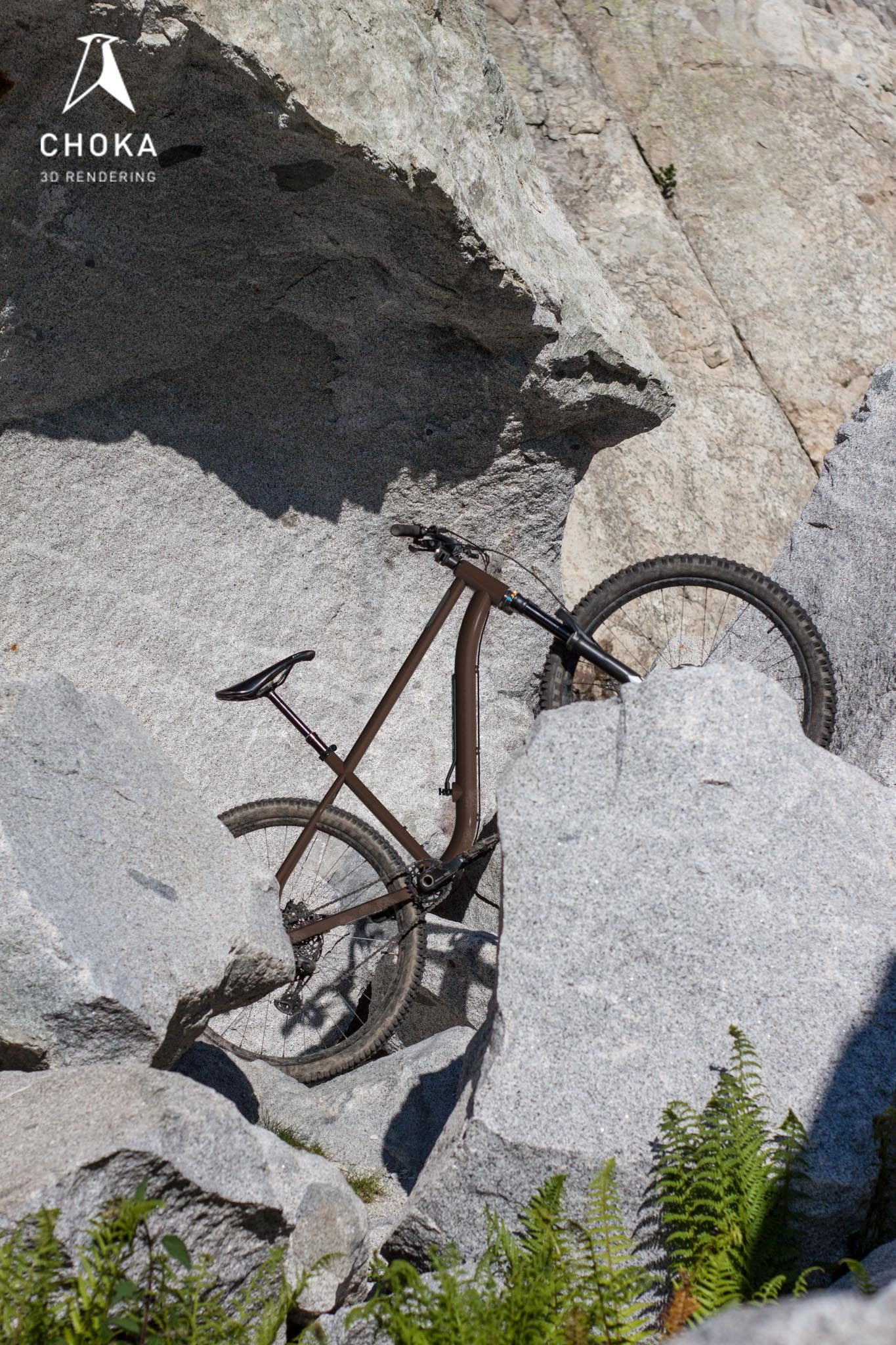 Deux cadres ont d’ores et déjà été développés, un gravel nommé Gravaël et un semi-rigide orienté trail / enduro qui répond au nom d’Aghata (acronyme d’Agressive Hardtail). Dans les deux cas, Choka a misé sur la polyvalence avec un boitier de pédalier sur excentrique qui permet d’opter pour différentes tailles de roues (29/29, 27,5/27,5 ou 29/27,5) ou de monter son vélo en singlespeed malgré les pattes fixes.
