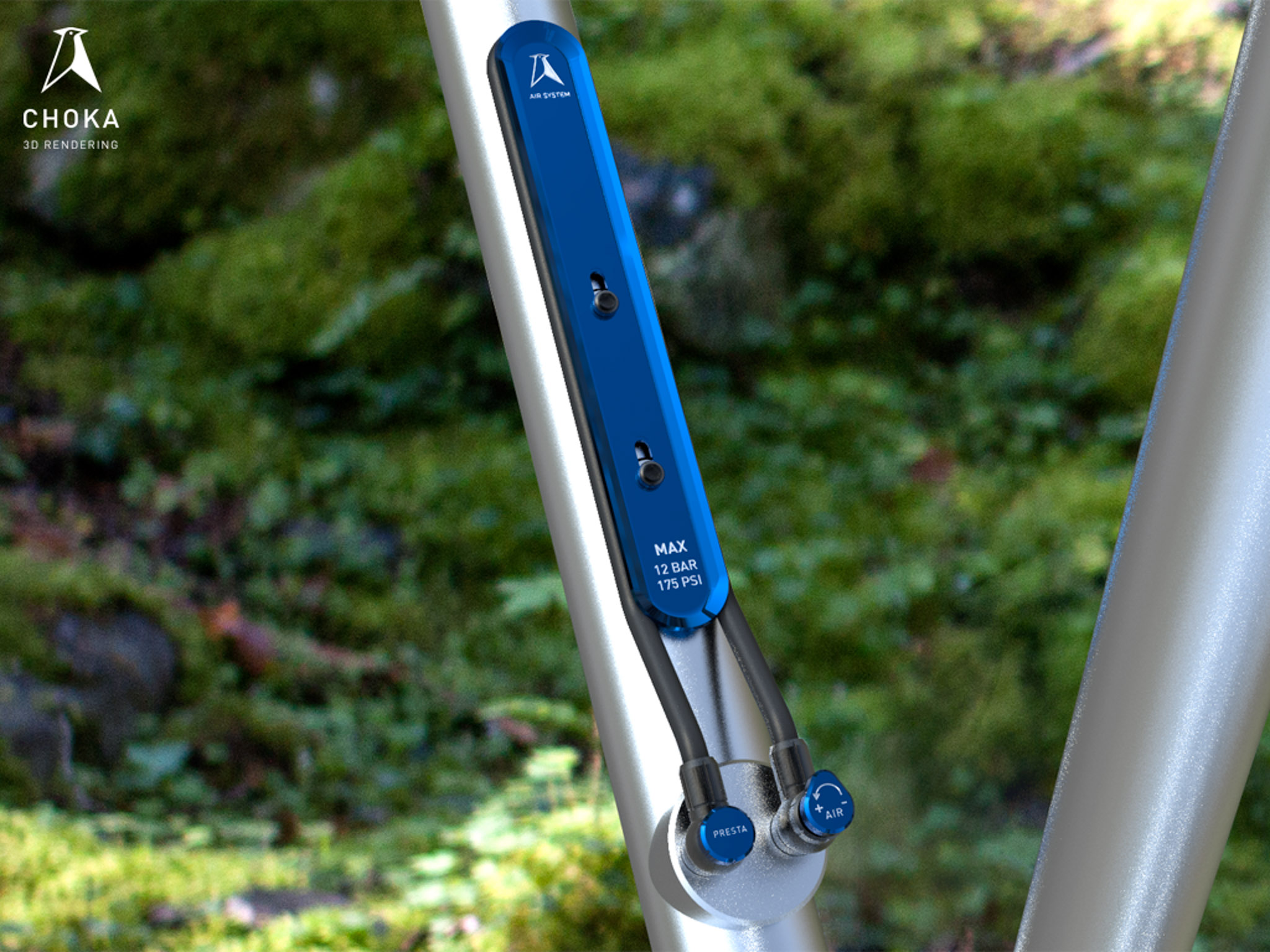 Le principe est extrêmement simple : on gonfle son cadre (oui, oui) jusqu’à 12 bars maximum et on va rouler ! En cas de besoin, on sort la Durit de son rangement, on la connecte à la valve de la roue concernée et avec le variateur de flux, on remet autant d’air dans ses pneus que nécessaire. Selon Choka, ces 12 bars suffisent pour faire monter 3 pneus en 27,5×2.8 à 1,5 bar tandis que le débit maximum du variateur permet de faire claquer facilement les pneus tubeless.