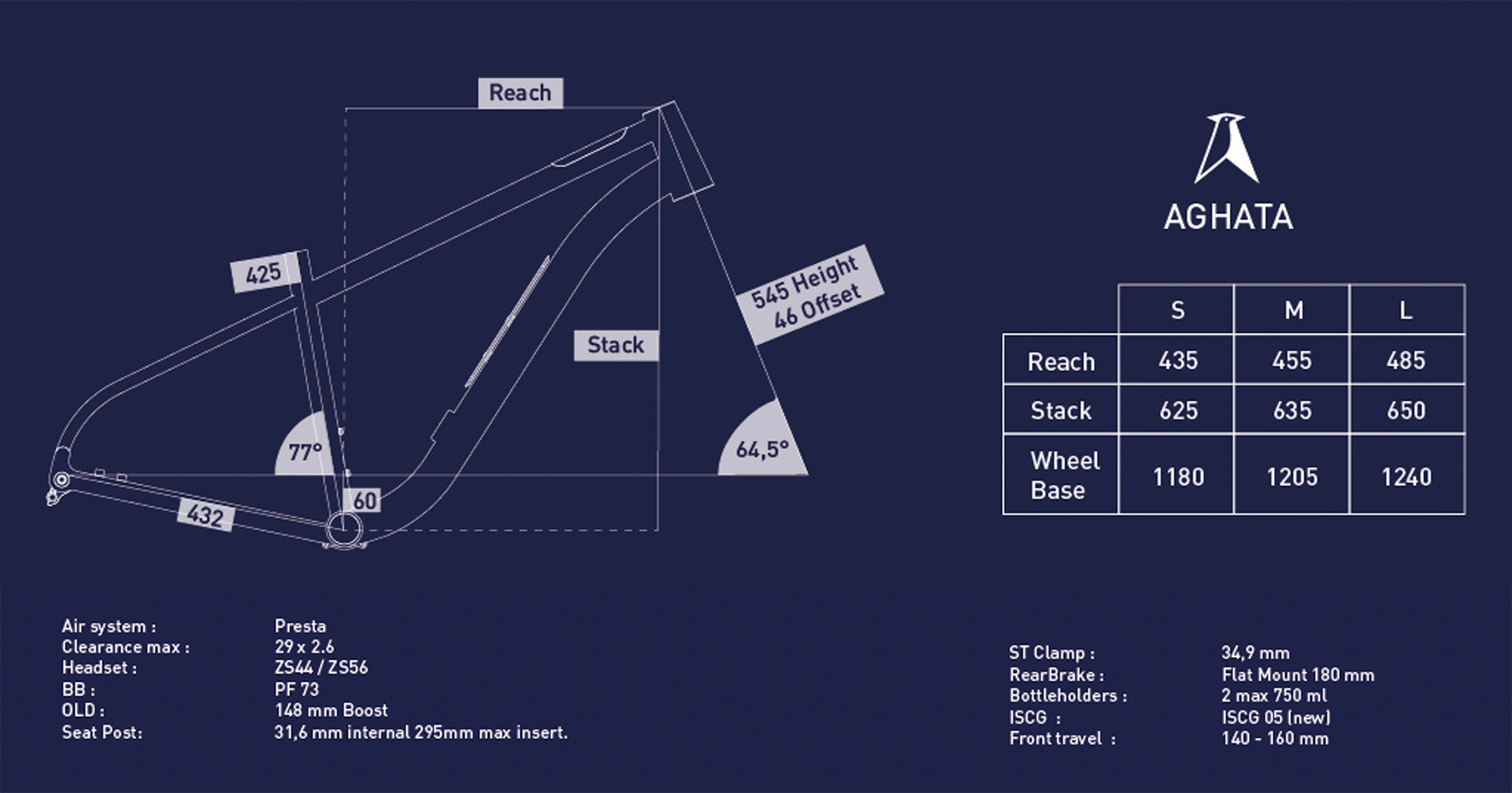Sur l’Aghata, l’angle de direction de 64,5° est couplé à un reach de 455 mm en taille M et à un angle de tube de selle de 77° ce qui donne une position digne d’un bon vélo d’enduro. Longues de 432 mm, les bases sont plutôt courtes pour le dynamisme et la maniabilité, sans excès toutefois afin de garder un peu de stabilité à haute vitesse et une certaine cohérence avec l’avant relativement long. Aucun montage complet n’est envisagé pour l’instant mais Choka conseille d’installer une fourche de 140 à 160 mm de débattement. Le dégagement est suffisant pour des pneus en 29×2.6 montés sur des jantes en 35 mm de largeur interne.