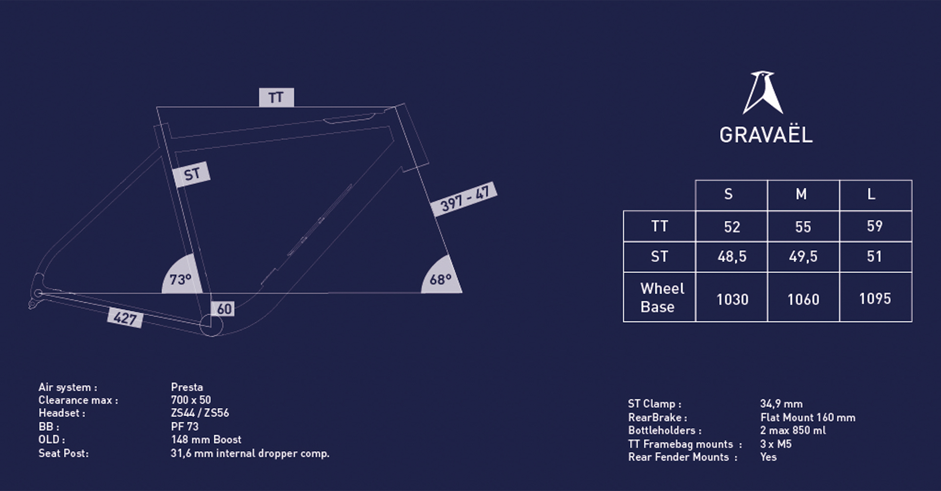 En ce qui concerne la géométrie, c’est une belle surprise puisque les deux vélos sont très modernes et clairement tournés vers le plaisir de pilotage, voire l’aventure plus que vers la performance. Sur le Gravaël, cela se manifeste surtout par un angle de direction audacieux de 68° (alors que la norme est plutôt autour de 71°-71,5° dans la catégorie) et un dégagement généreux (700×50 ou 650×60).