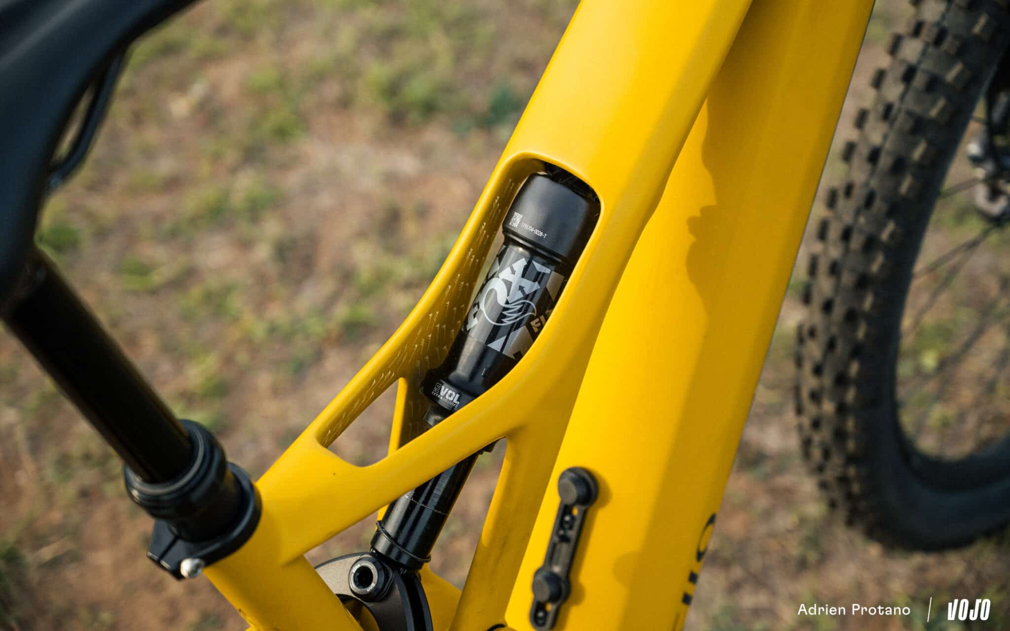 Le cadre en carbone affiche cette construction particulière où le tube supérieur est ouvert pour accueillir la tête de l’amortisseur, le tout avec des lignes esthétiques marquées.