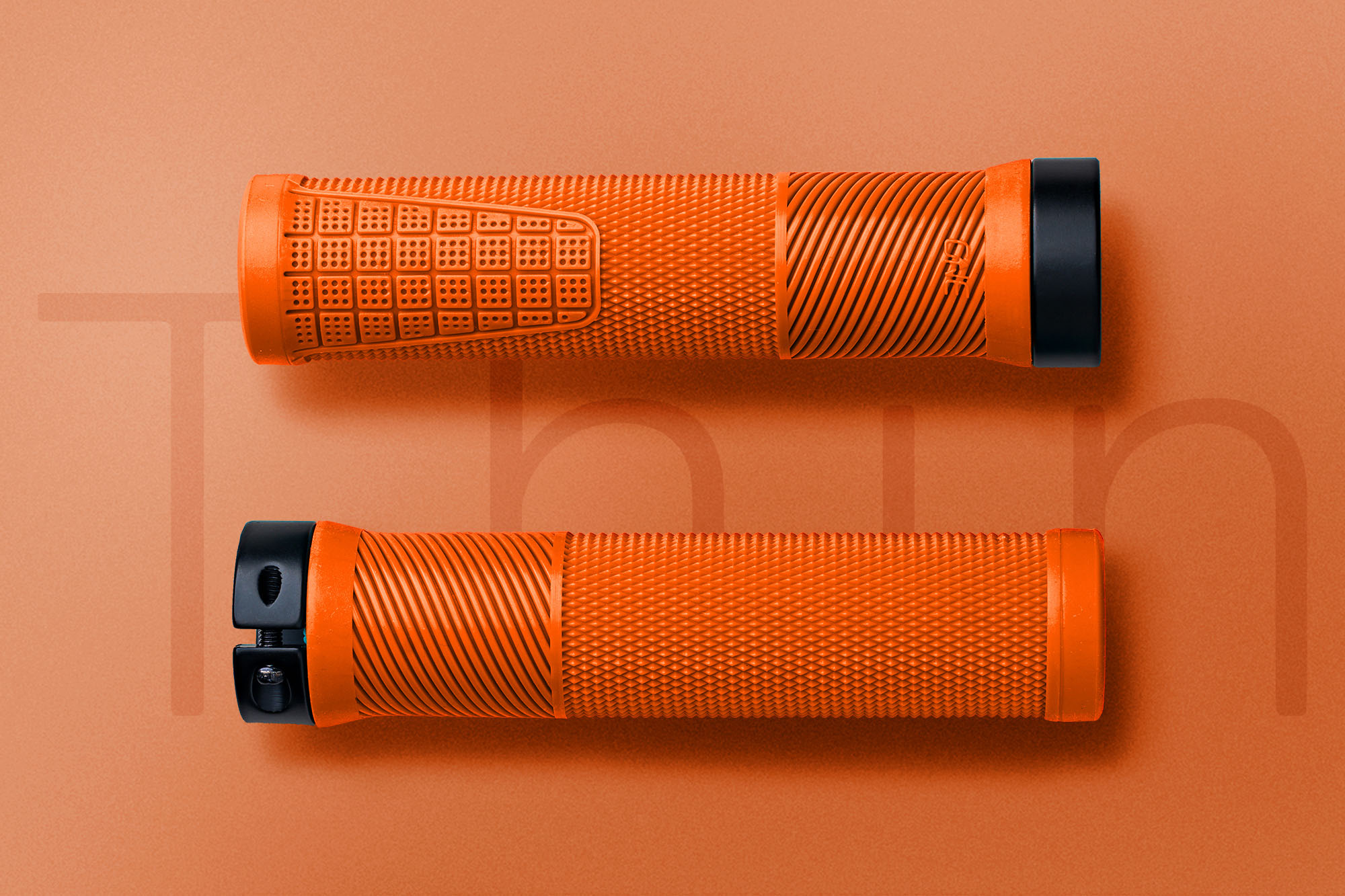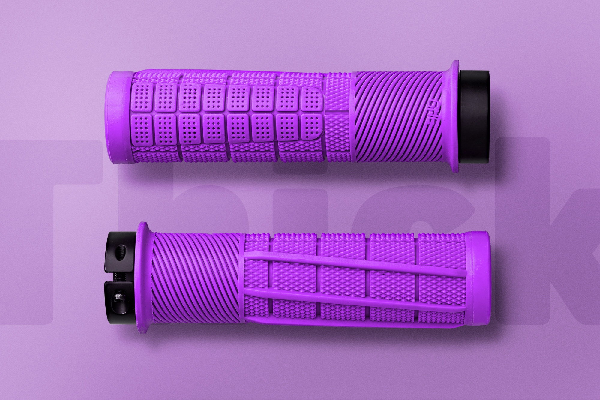 En matière de poignées, il y a deux écoles et la marque l’a bien compris : voici les Thin Grips et les Thick Grips, selon qu’on préfère les poignées fines ou les modèles plus épais. Les Thin Grips, à droite ci-dessus, ont un diamètre de 29 mm et une gomme en 25 A tandis que les Thick Grips (à gauche, en violet) mesurent entre 32,5 et 35 mm suivant la zone et reprennent la gomme très tendre (20 A) du modèle déjà au catalogue.