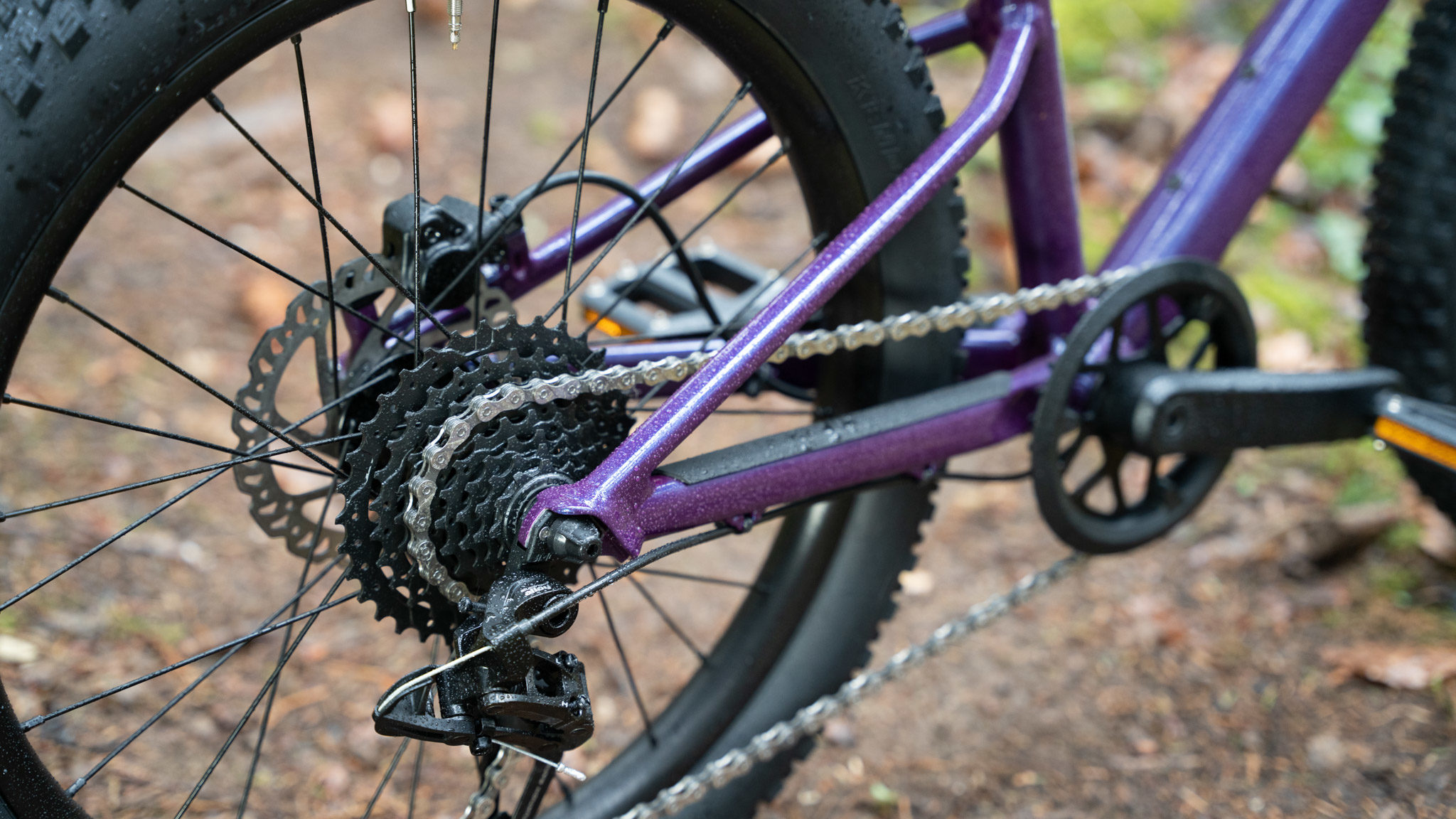 On retrouve ainsi toutes les caractéristiques qui font de ces petites machines de superbes montures pour les plus jeunes : une géométrie qui met en confiance avec des bases longues, un angle de direction à 68° et un tube de selle court, une conception simple sans aucune suspension et des points d’appuis adaptés, tels qu’un cintre large (650 mm) de plus petit diamètre, une potence courte (40 mm) et des manivelles courtes elles aussi (127 mm en 20″, 140 mm en 24″).