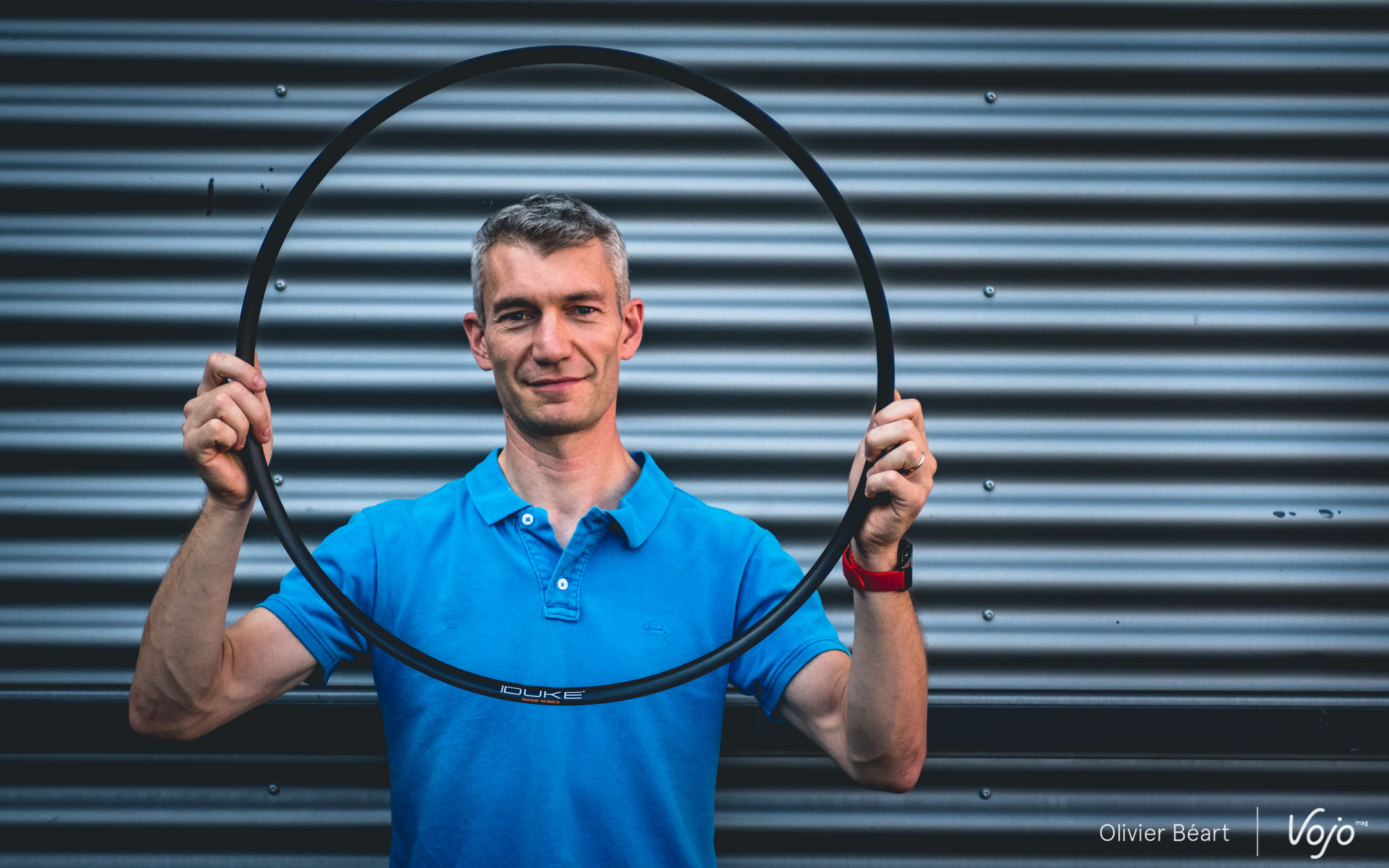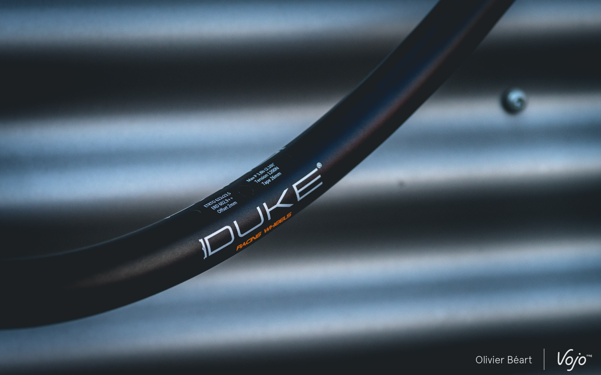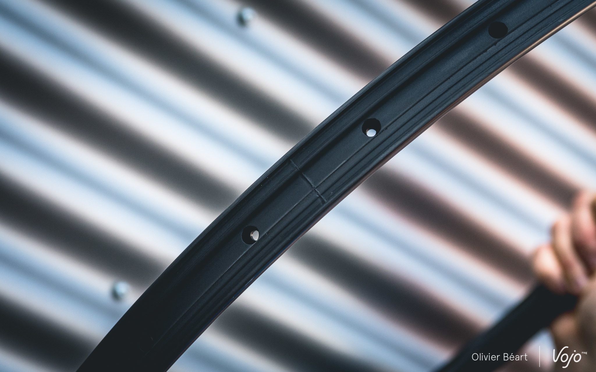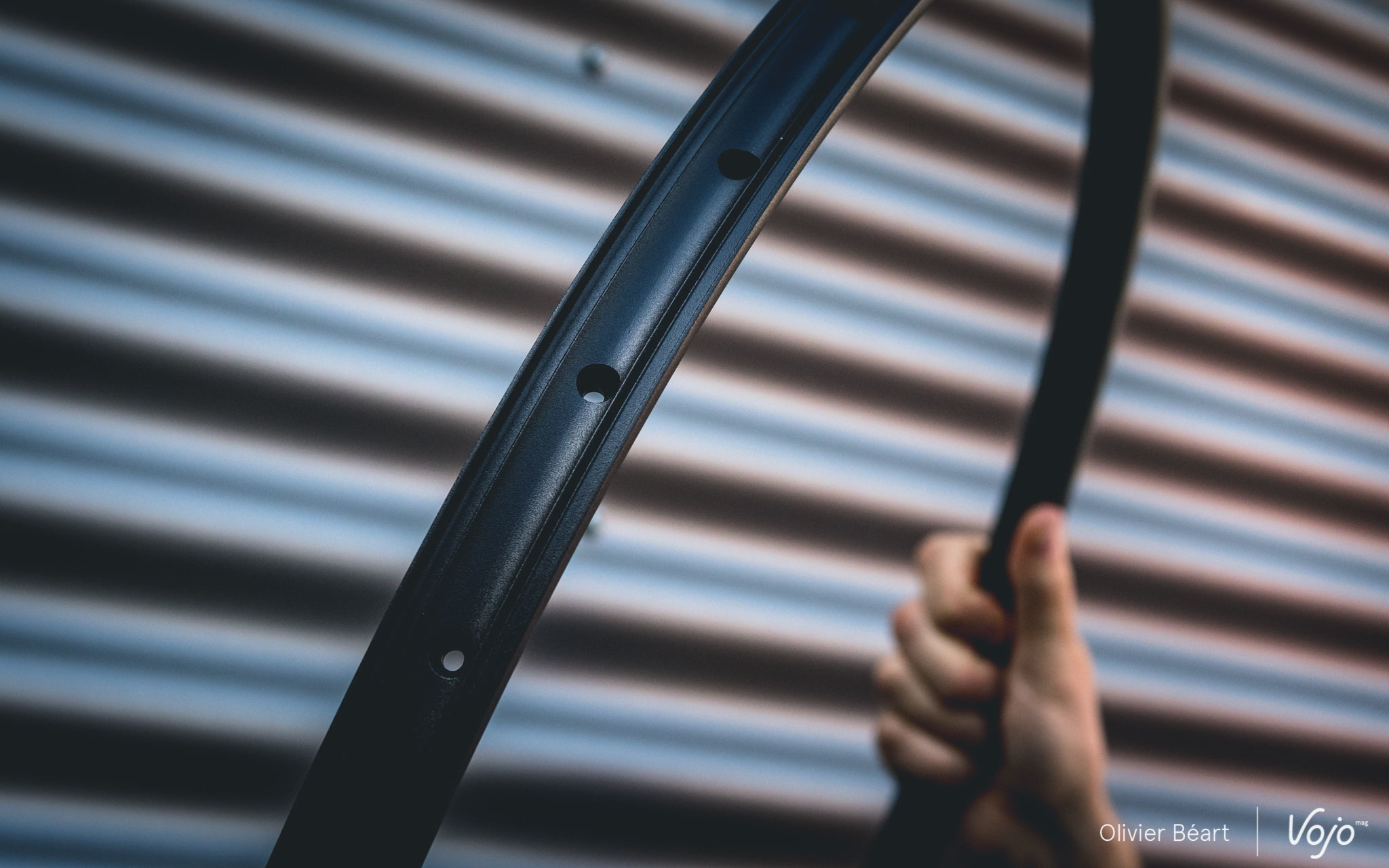 « Nous avons mis au point notre propre forme d’extrusion avec un profil externe assez arrondi, inspiré de celui d’une coquille d’oeuf. La jante fait 23,5mm de large en interne (design hookless) et seulement 16mm de haut pour garder une bonne capacité de déformation verticale. On arrive à un poids de seulement 360g en 29 » pour un prix de 95€ », explique monsieur JP Racing.