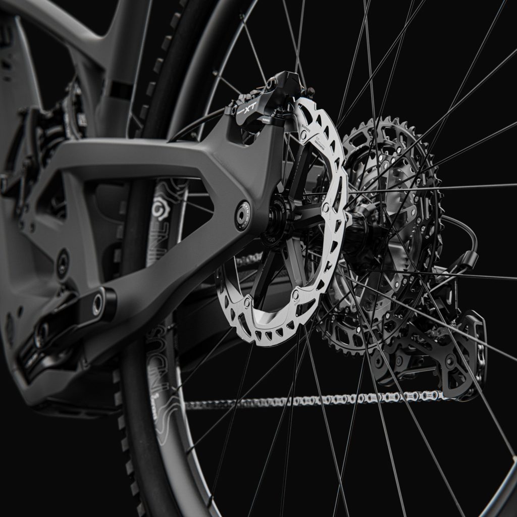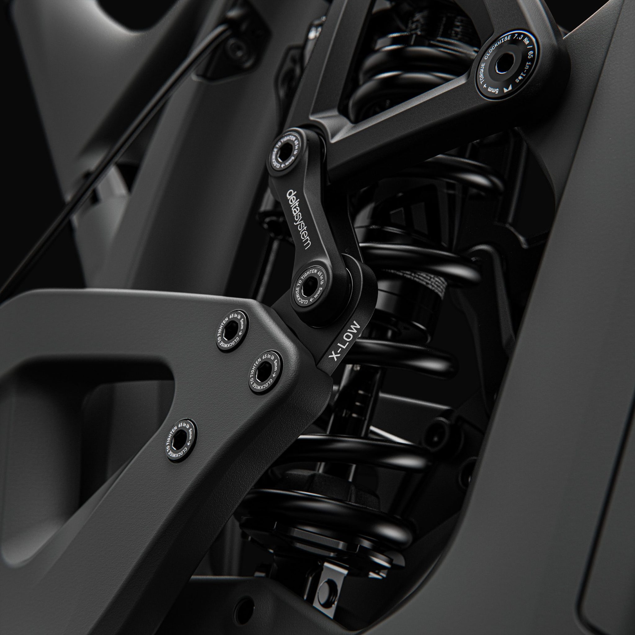 Le cadre est en carbone à l’avant comme à l’arrière et seules les multiples biellettes de l’iconique suspension Delta, une des clés de l’identité de la marque, restent en aluminium. Comme évoqué en introduction, l’Epocalypse développe 166 mm de débattement à l’arrière, pour 170 mm à l’avant.