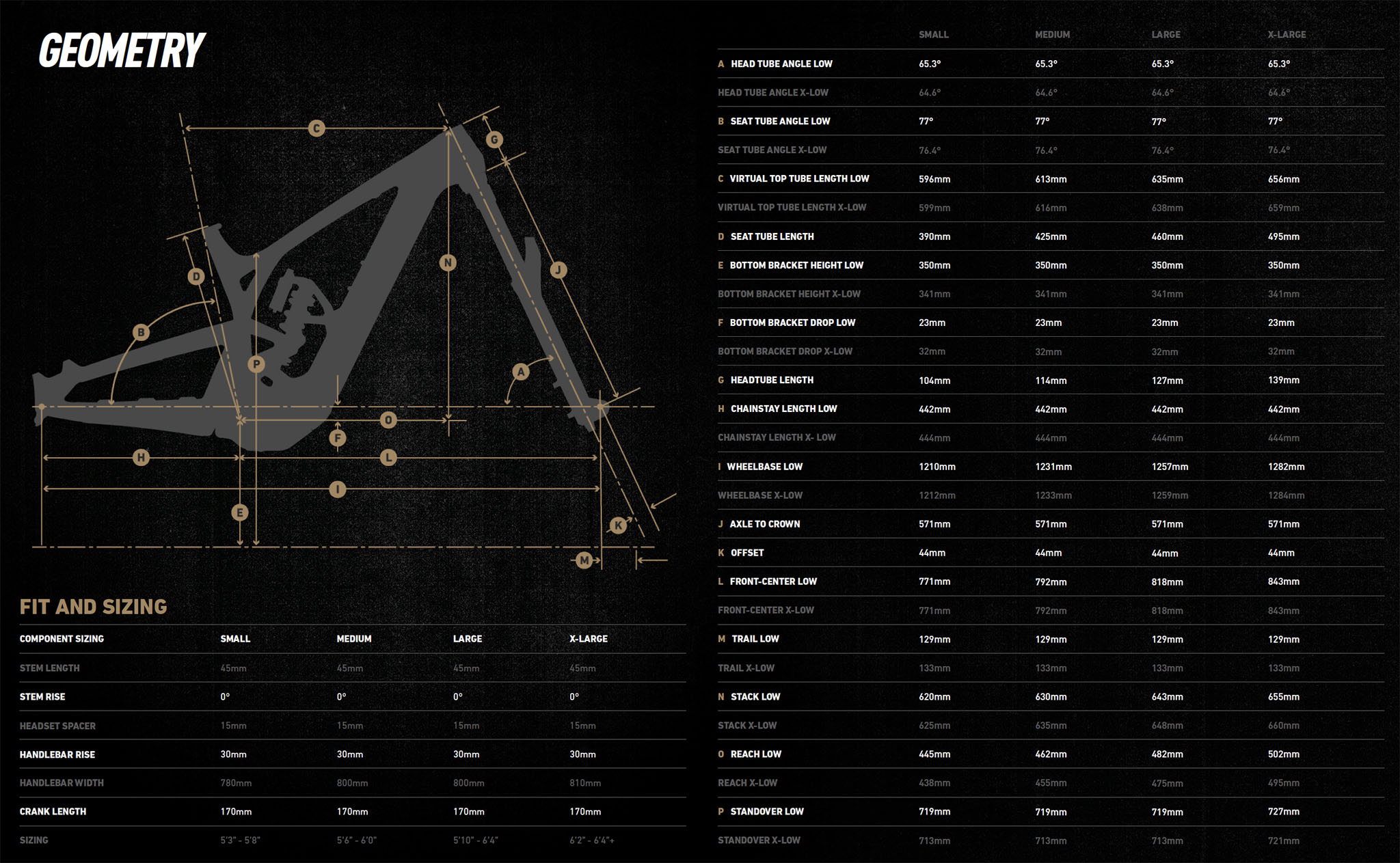Malgré le débattement assez important et le positionnement, la géométrie devrait offrir une certaine polyvalence au vélo : angle de direction de 65,3°, angle de tube de selle à 77°, reach de 462 mm en taille M et bases plutôt courtes (pour un e-bike) de 442 mm.