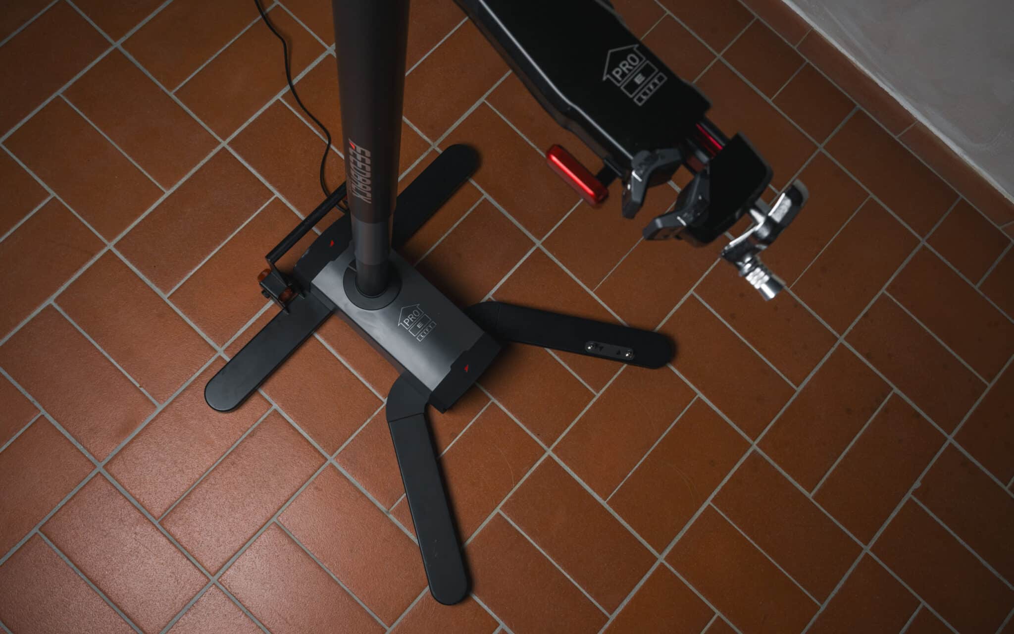 Le Feedback Pro-E-Lift permet de soulever jusqu’à 50 kg, le contrôle de la hauteur s’effectuant avec les deux petits boutons situés sur l’une des bases au sol, que l’on commande avec notre pied. On imagine très bien l’utilité d’un tel pied pour fixer et travailler sur un e-bike sans risquer de se faire mal au dos.
