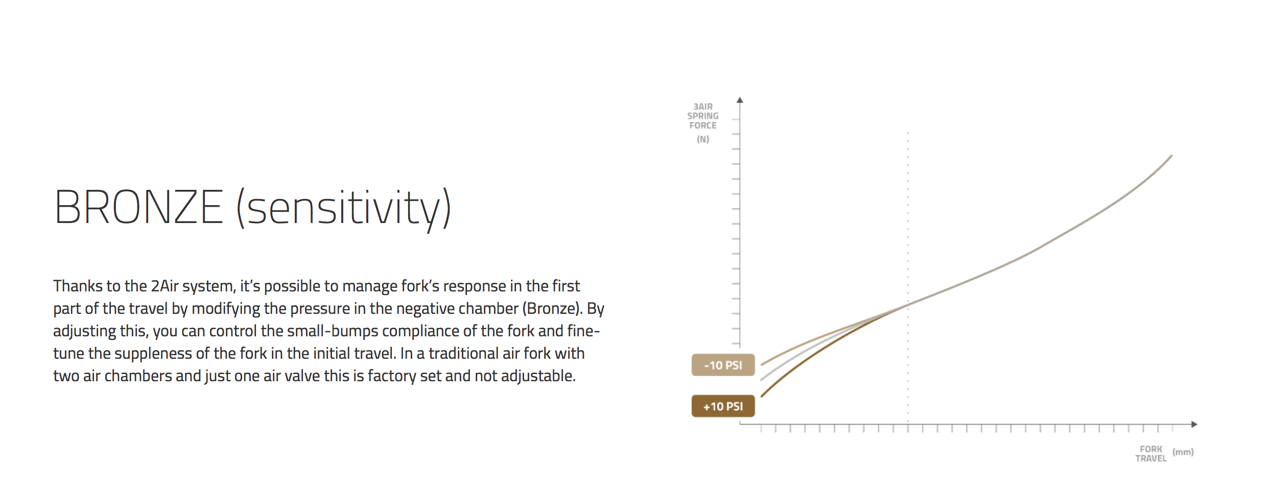 La pression dans cette chambre négative (baptisée ici « Bronze ») va déterminer la sensibilité de la fourche en début de course.