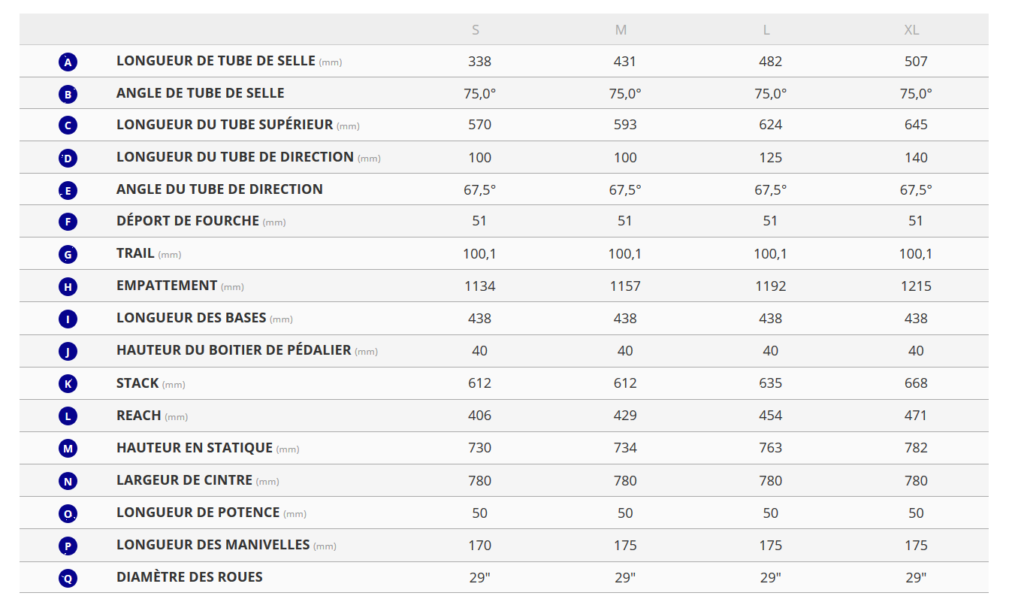 La position est un peu moins portée sur l’engagement en montée comme en descente, avec un buste plus droit au pédalage grâce au tube supérieur plus court (593 mm en taille M, 19 mm de moins que sur le Trance). Lorsque la pente penche dans l’autre sens, l’accent a été mis sur la maniabilité plutôt que sur la stabilité à haute vitesse avec un reach raccourci (429 mm contre 442 mm en taille M). L’angle de direction affiche quant à lui 67,5° et les bases mesurent 438 mm, une longueur dans la moyenne. De manière générale, la géométrie est très proche du Stance 27,5 et met clairement l’accent sur la facilité de prise en main.