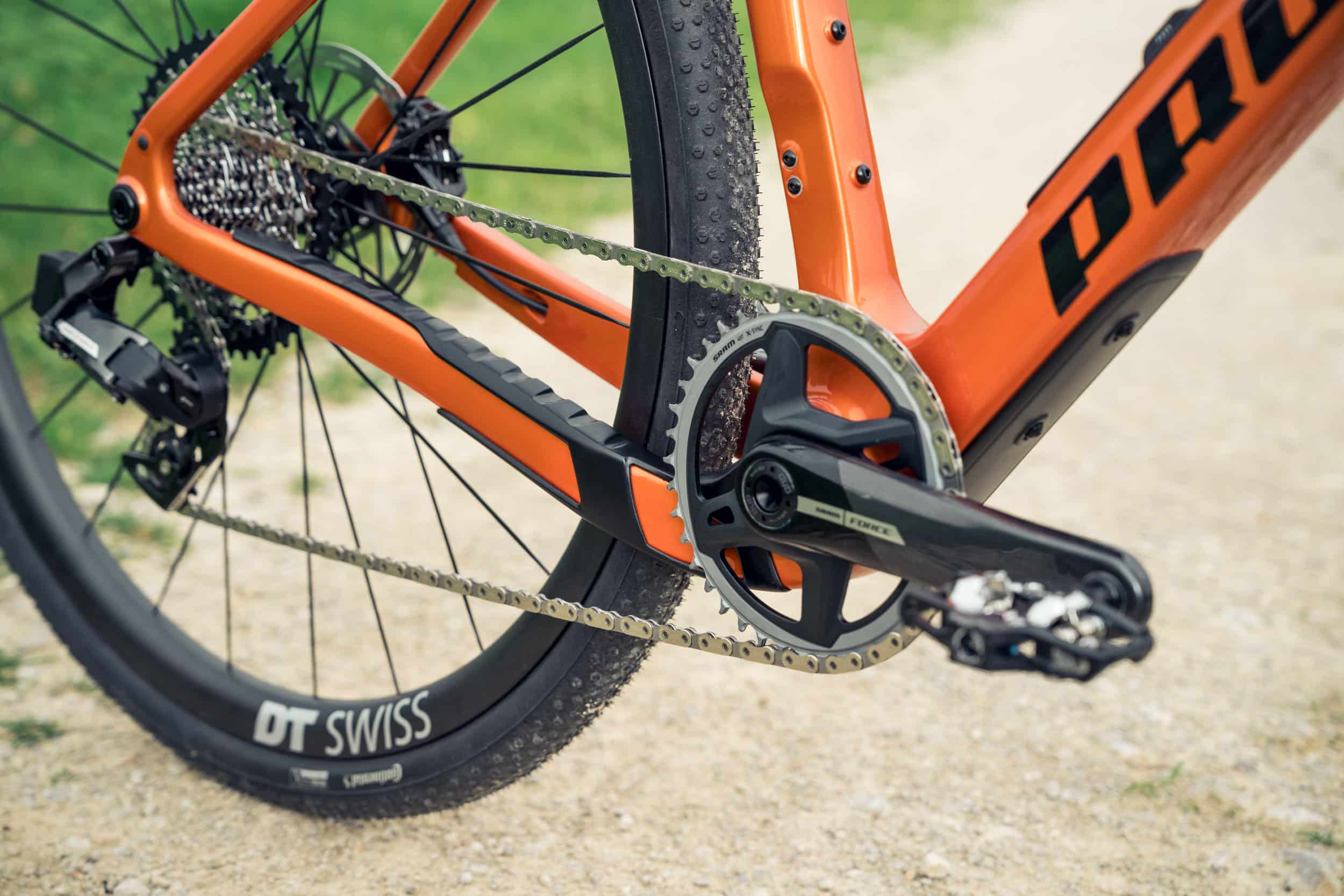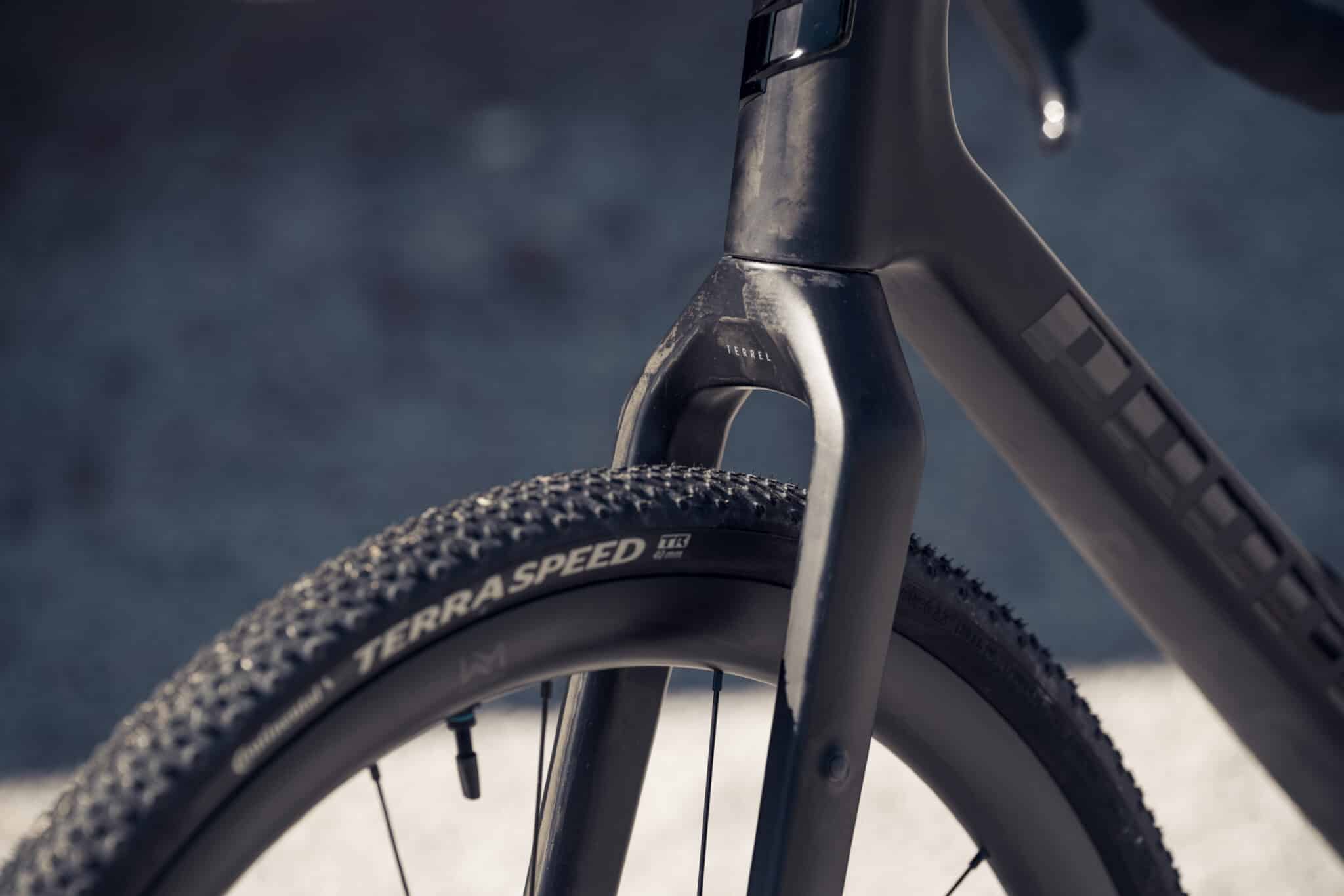 Ainsi, le Terrel peut être monté en double plateau ou en monoplateau et il adopte le format UDH pour la patte de dérailleur, afin d’accepter les derniers dérailleurs Sram AXS de VTT pour les amateurs de transmission « mulet » (dérailleur et cassette de VTT avec pédalier et commandes de route).