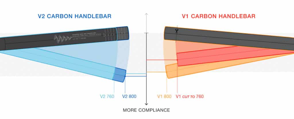 Le V2 absorberait, d’après la marque, jusqu’à 33 % de vibrations en plus que le V1 (selon la largeur et le rise choisis), en demeurant tout aussi résistant. Ce gain a été obtenu en retravaillant la forme ovale du guidon.