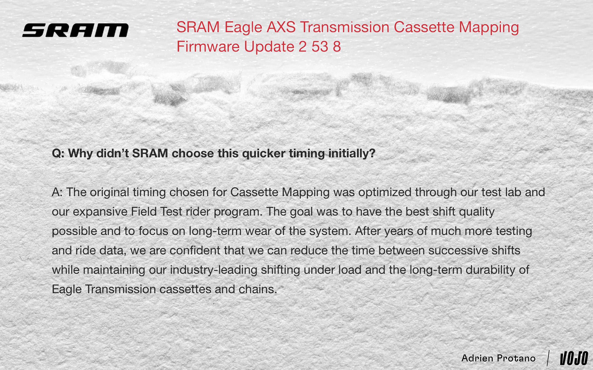 Il y a une question que l’on est en droit de se poser : Pourquoi Sram n’a-t-il pas proposé cette fonctionnalité avant ? La marque répond que « le calage initial a été optimisé grâce à notre laboratoire d’essais et à notre vaste programme de tests terrain avec des pilotes. L’objectif était d’obtenir la meilleure qualité de changement de vitesse possible tout en privilégiant la durabilité à long terme du système. Après plusieurs années de tests supplémentaires et de collecte de données terrain, nous sommes désormais confiants dans notre capacité à réduire le temps entre deux passages de vitesses successifs. »