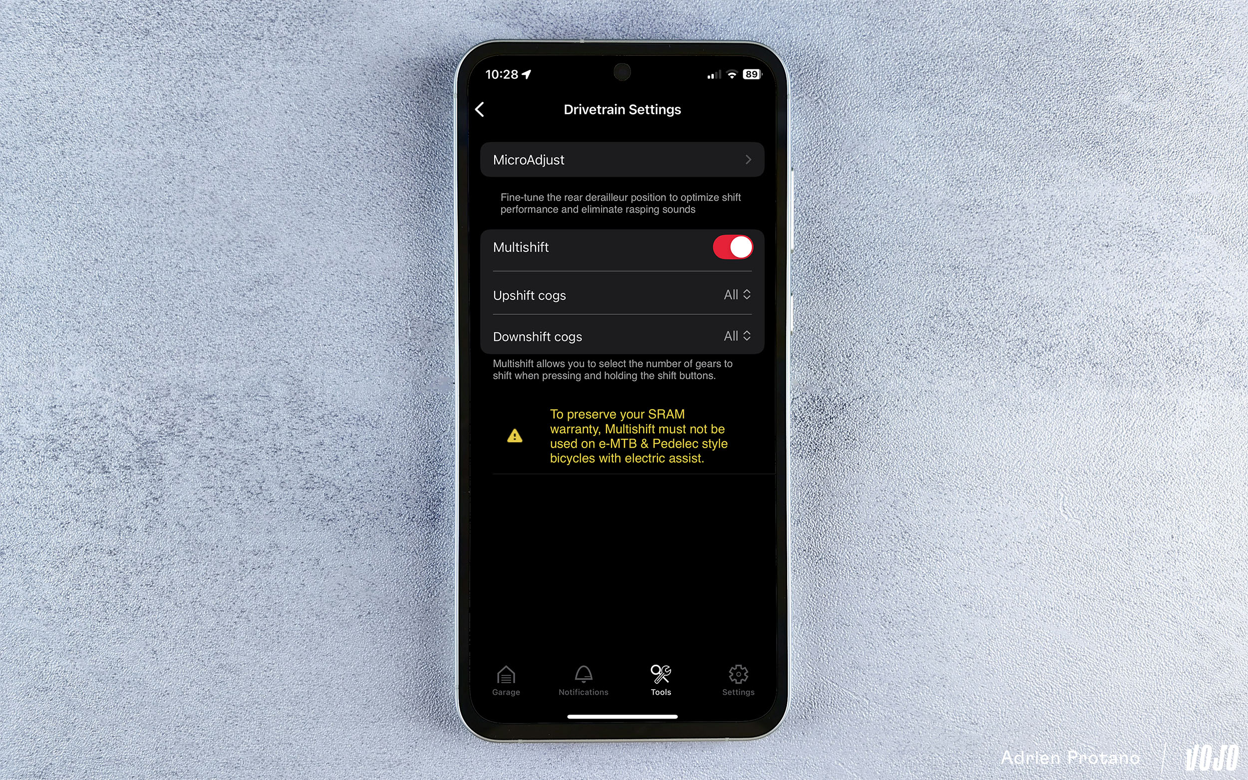 On insiste. Cette mise à jour ne vise que le changement de rapport multiple, soit trois rapports ou plus d’un coup, que ce soit en appui répété ou en appui prolongé sur la commande. Pour rappel, il est effectivement possible de configurer la commande AXS au guidon pour passer plusieurs rapports en gardant le doigt appuyé sur la commande, Sram nomme cette fonction le Multi-Shift. On y revient un peu plus bas.