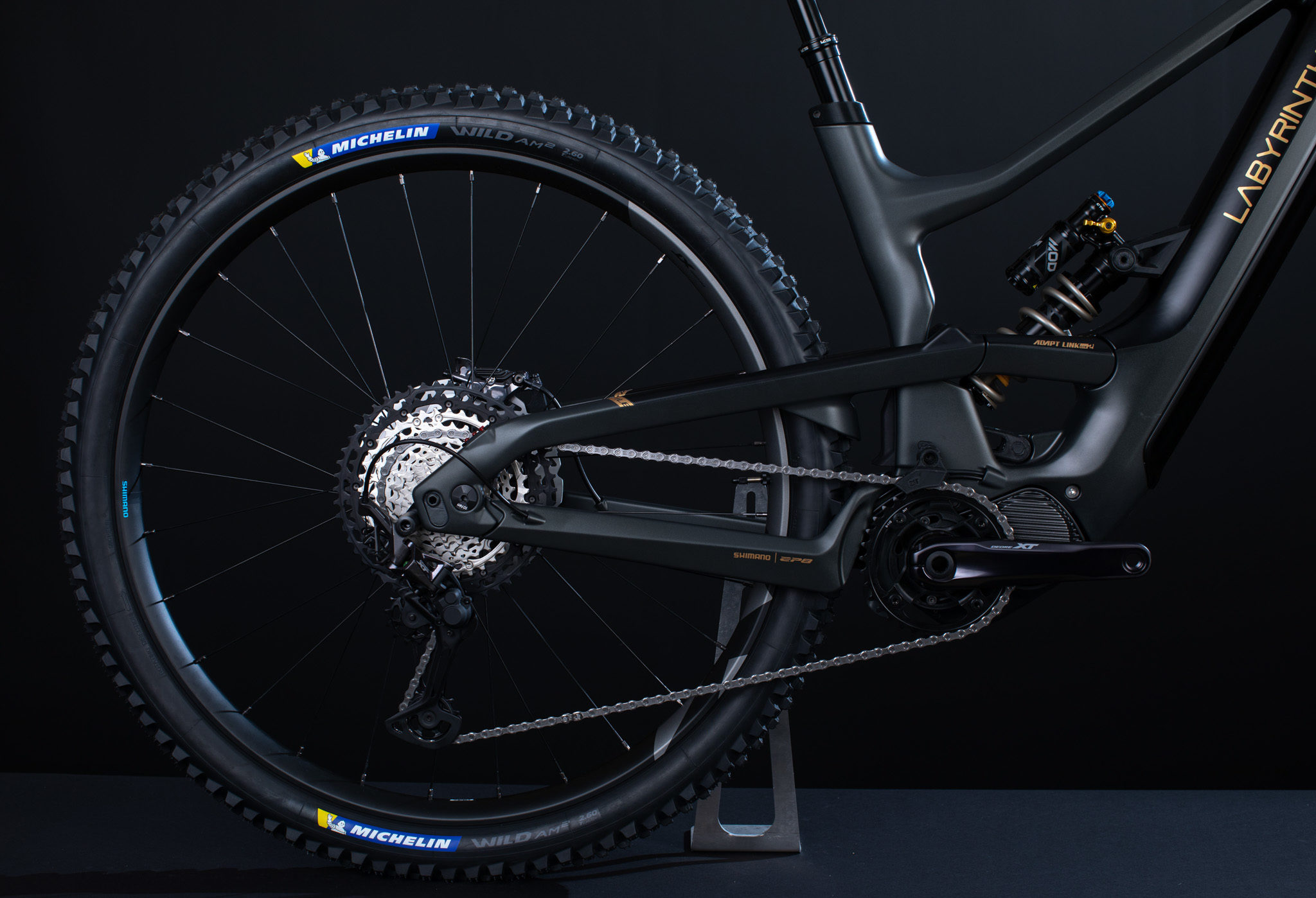 Seulement deux tailles de cadres sont disponibles (T3 et T4) mais Labyrinth a misé sur la personnalisation du vélo pour rendre l’E-Agile accessible à la plupart des pratiquants. Grâce à différentes coupelles de direction, on peut ainsi faire varier la longueur du triangle avant de 16 mm (neutre, – 8 mm et + 8 mm). Dans le même temps, il est possible de monter une roue arrière en 27,5″ en changeant un insert au niveau de l’axe de roue.