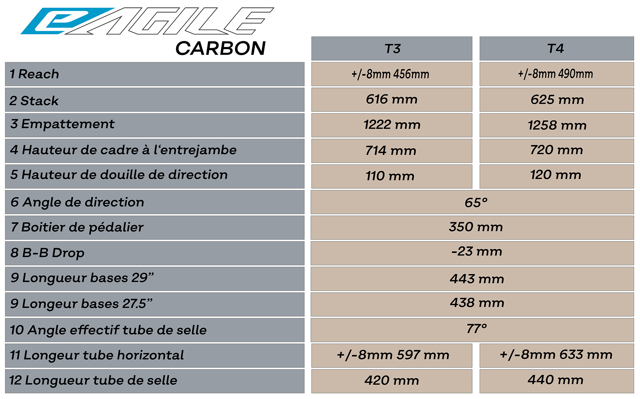 S’il ne partage plus grand chose avec l’Agile (carbone au lieu de l’aluminium, 27,5″ ou 29″ au lieu du 26″), l’E-Agile repose toutefois sur une plateforme au débattement similaire : 154 mm pour l’ancien Agile et 150 mm ici, avec une fourche en 160 mm.