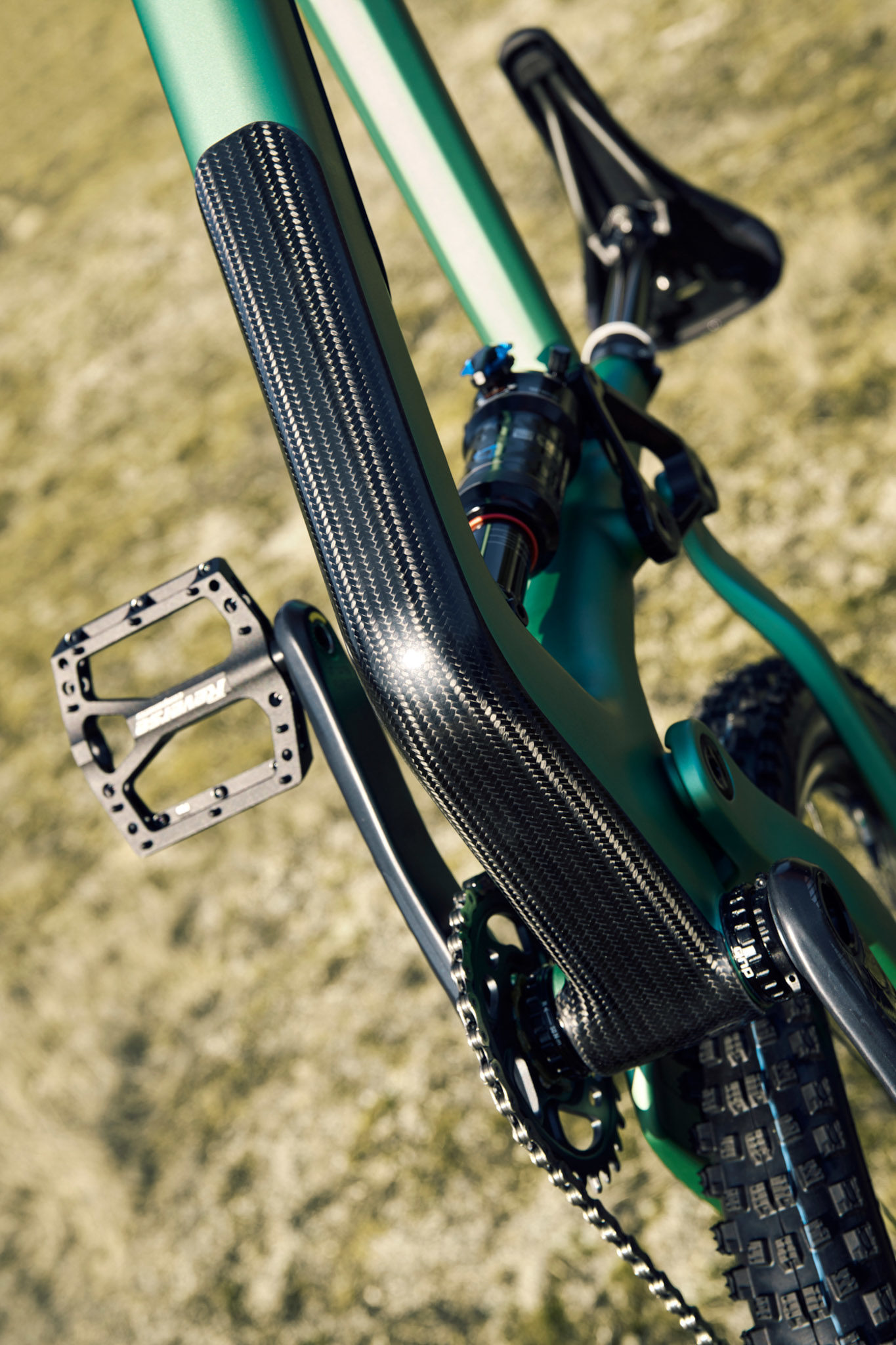 Comme toujours sur les Last, la finition est particulièrement soignée : le tube diagonal est protégé par une longue pièce de carbone tapissée de mousse (pour mieux absorber les impacts plutôt que les retransmettre directement au cadre), les gaines passent en interne mais sont entièrement guidées et on peut choisir entre plusieurs options de finition, du raw jusqu’à la peinture personnalisée.