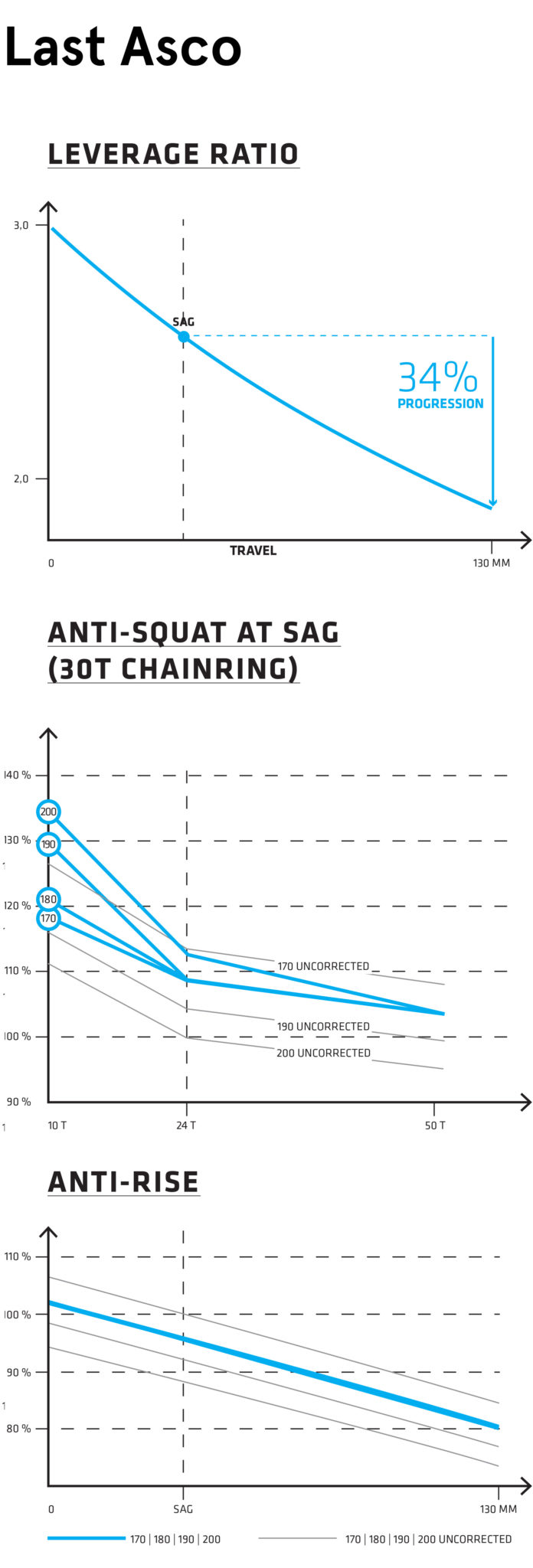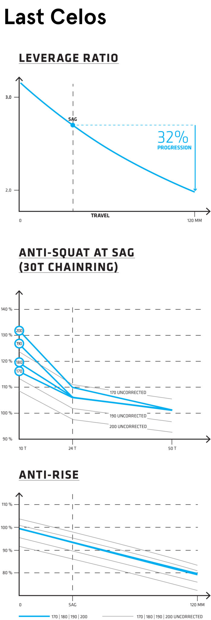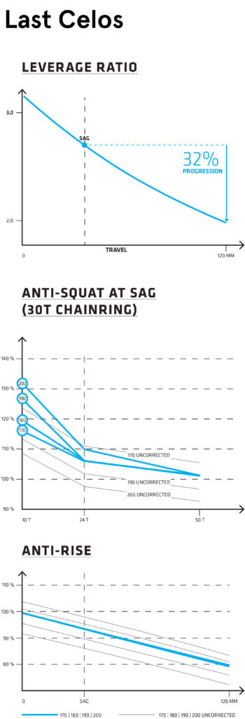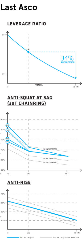 Last l’a conçue pour être très progressive (32 % sur le Celos, 34 % sur l’Asco) et avec des ratios de départ assez haut, ce qui laisse présager d’une belle sensibilité en début de course. Par ailleurs, l’anti-squat est assez élevé donc on peut imaginer des vélos plutôt dynamiques, tandis que l’anti-rise est lui relativement neutre. Comme d’habitude, si vous avez un peu de mal avec ces termes techniques, n’hésitez pas à aller faire un tour dans notre lexique !
