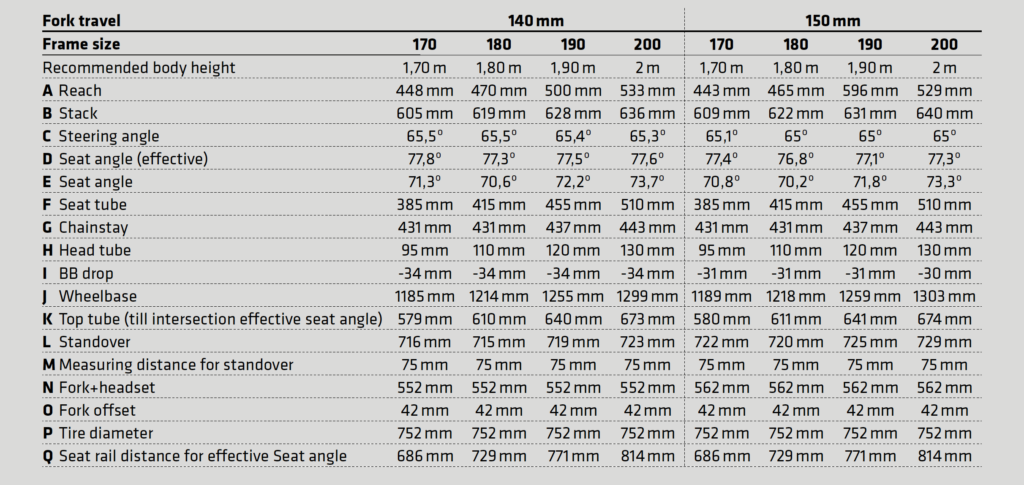 Logiquement, les angles sont un peu plus couchés et le reach un peu plus court du fait de la fourche plus haute. Avec un modèle en 140 mm, on a ainsi un angle de direction entre 65,3 et 65,5°, un angle de tube de selle entre 77,3 et 77,8°, des bases de 431 à 443 mm et un reach à 448 mm en taille 170 ou 470 mm en taille 180. Le montage d’une fourche en 150 mm fait perdre encore 0,4 à 0,5° aux angles, et 5 mm au reach.