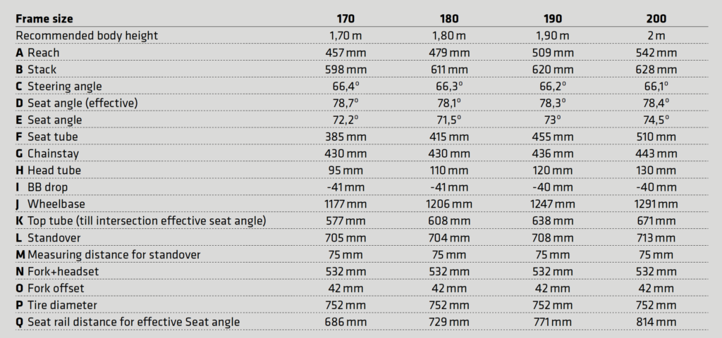 Comme souvent chez les petites marques allemandes, la géométrie est à la pointe de ce qui se fait actuellement, voire d’avant-garde : angle de direction entre 66,1 et 66,4°, angle de tube de selle entre 78,1 et 78,7°, bases qui varient de 430 à 443 mm selon la taille et reach à 457 mm en taille 170 (taille du pilote, équivalent à du SM) ou 479 mm en taille 180 (équivalent ML).