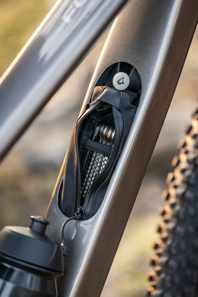 Le vélo est équipé d’une boîte à gants pour ranger ses affaires (matériel de réparation, veste légère…) ! Si ce système de stockage est maintenant presque courant sur les tout-suspendus d’un certain débattement, il est encore très rare, pour ne pas dire exceptionnel, sur les semi-rigides. C’est donc surprenant d’en trouver un ici, d’autant que Focus a fait partie des dernières marques à l’adopter et ne le proposait que sur un seul vélo (le Jam carbone, lire Test nouveauté | Focus Jam 8.9 : le Jam se met au carbone) mais on ne va certainement pas bouder notre plaisir.