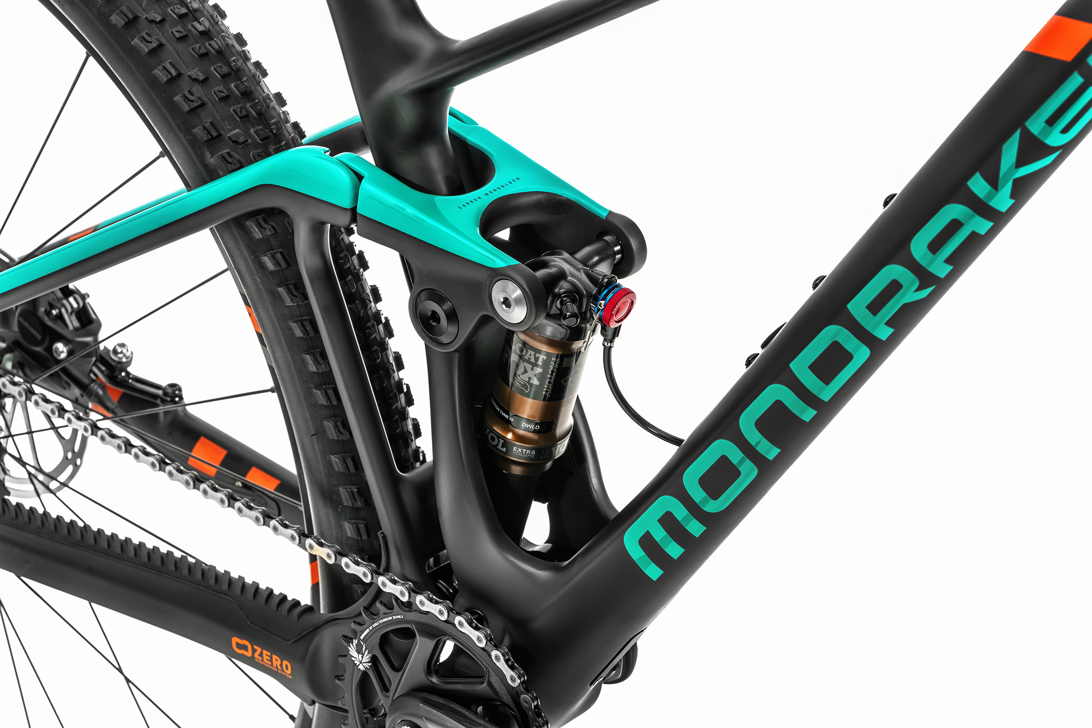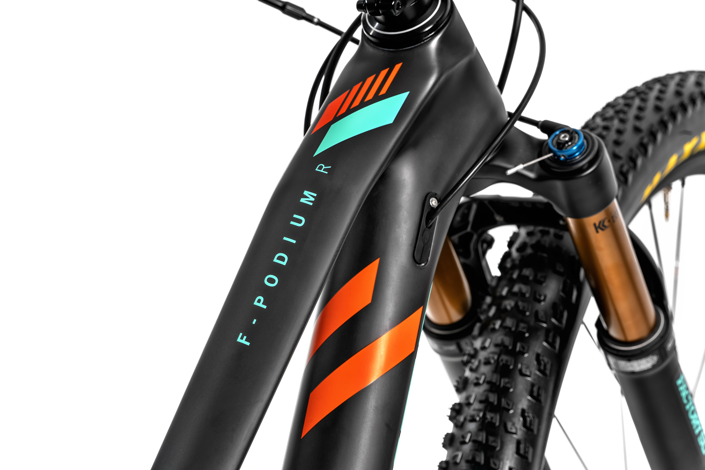 Développé en collaboration avec les coureurs du team Primaflor-Mondraker, le F-Podium dispose de 100 mm de débattement à l’avant comme à l’arrière. Le cadre reprend la célèbre cinématique Zero de la marque, avec point de pivot virtuel et amortisseur flottant. Ce dernier est aux formats Trunnion pour la fixation haute (dans une version XC très épurée) et Metric pour le dimensionnement. La manette de blocage permet de gérer simultanément la fourche et l’amortisseur.