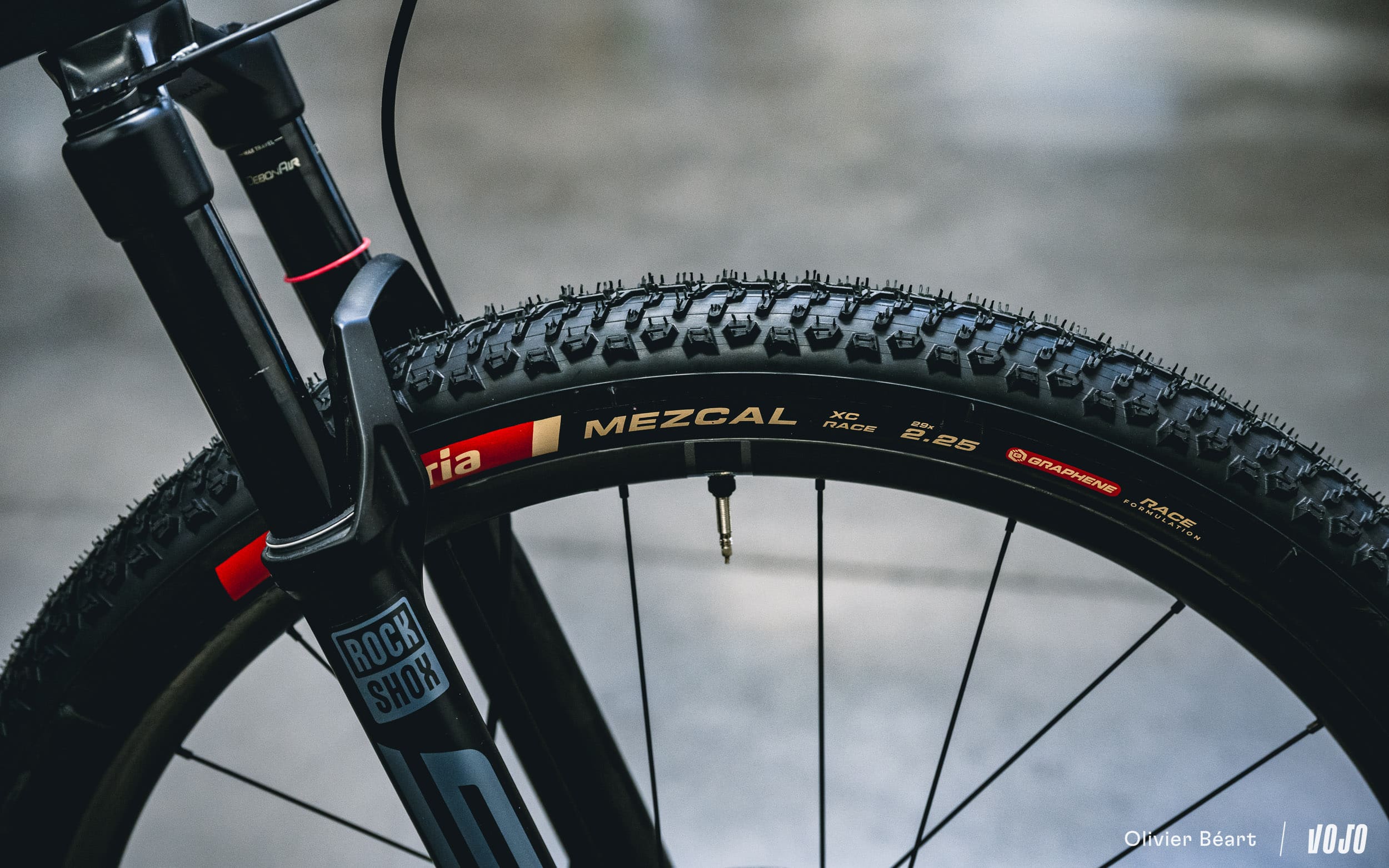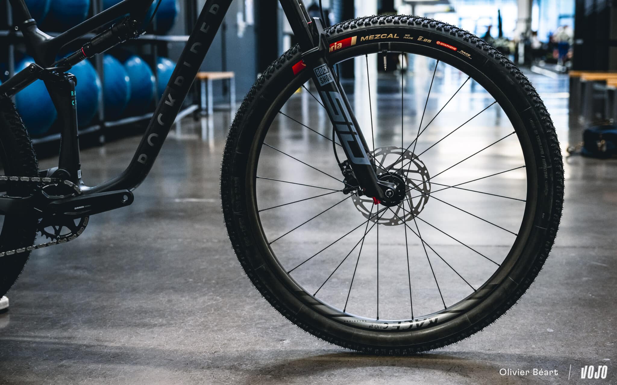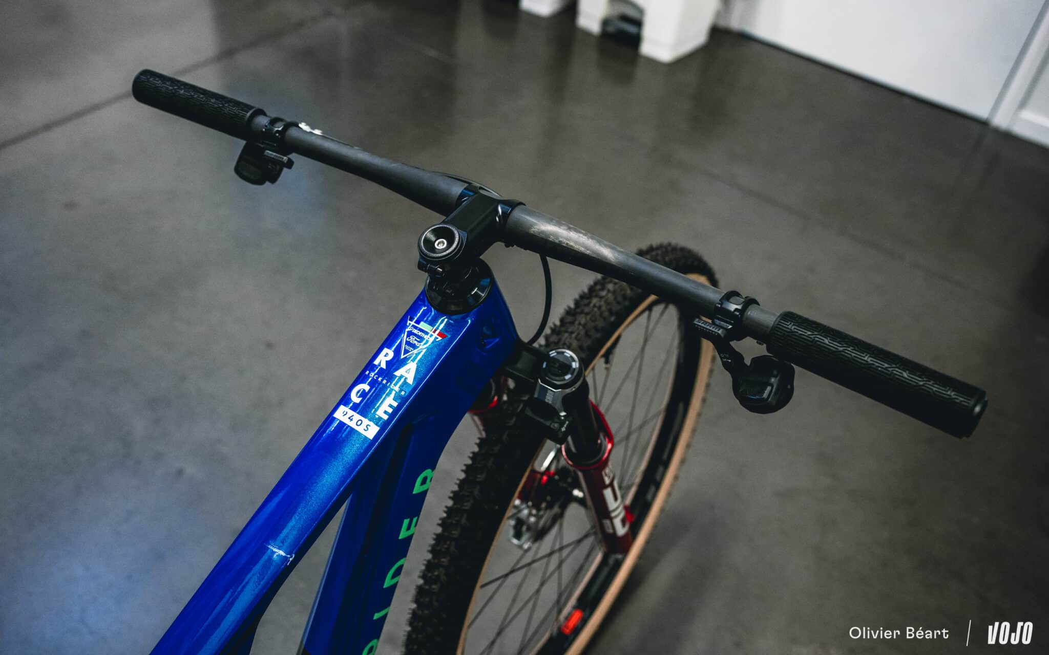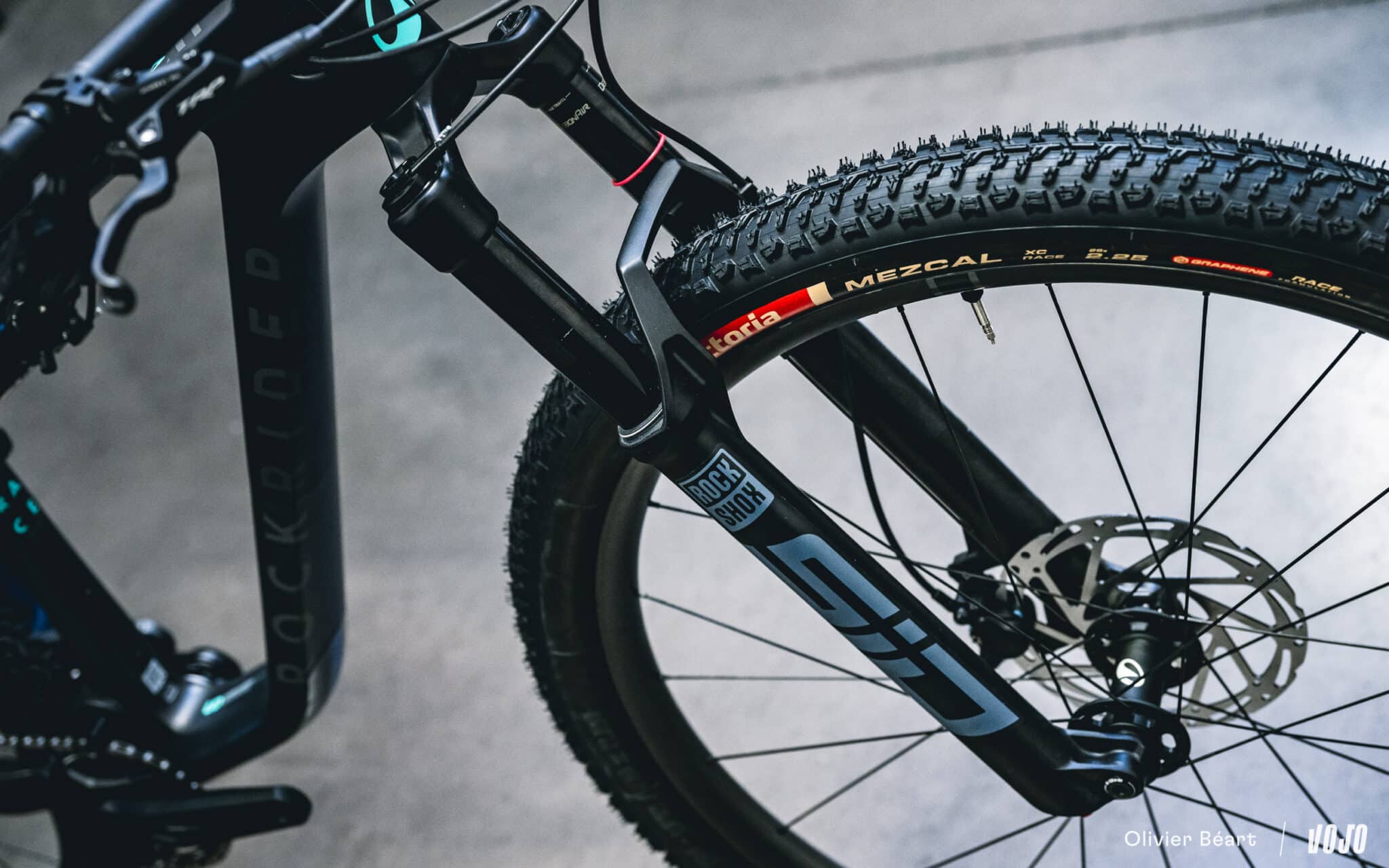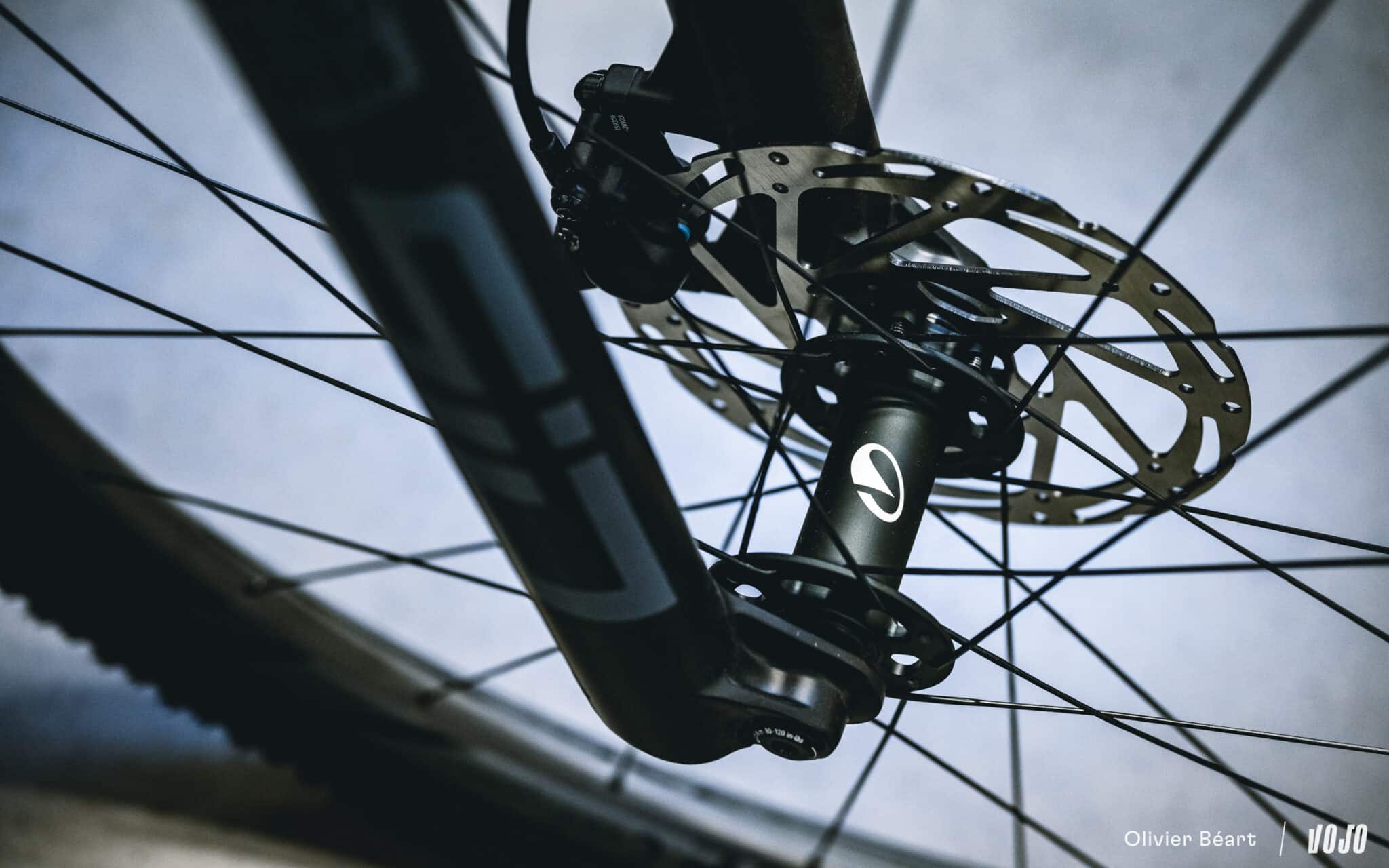 Ces roues sont chaussées de pneus Vittoria Mezcal en 2.25. Le choix de cette section est lié à des questions d’homologation officielle du cadre, mais du 2.4 passe sans problème.