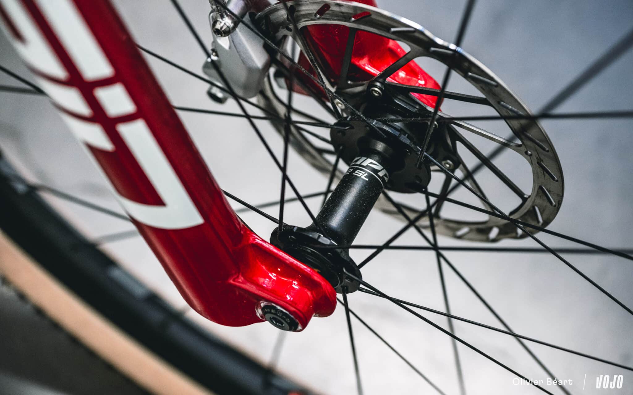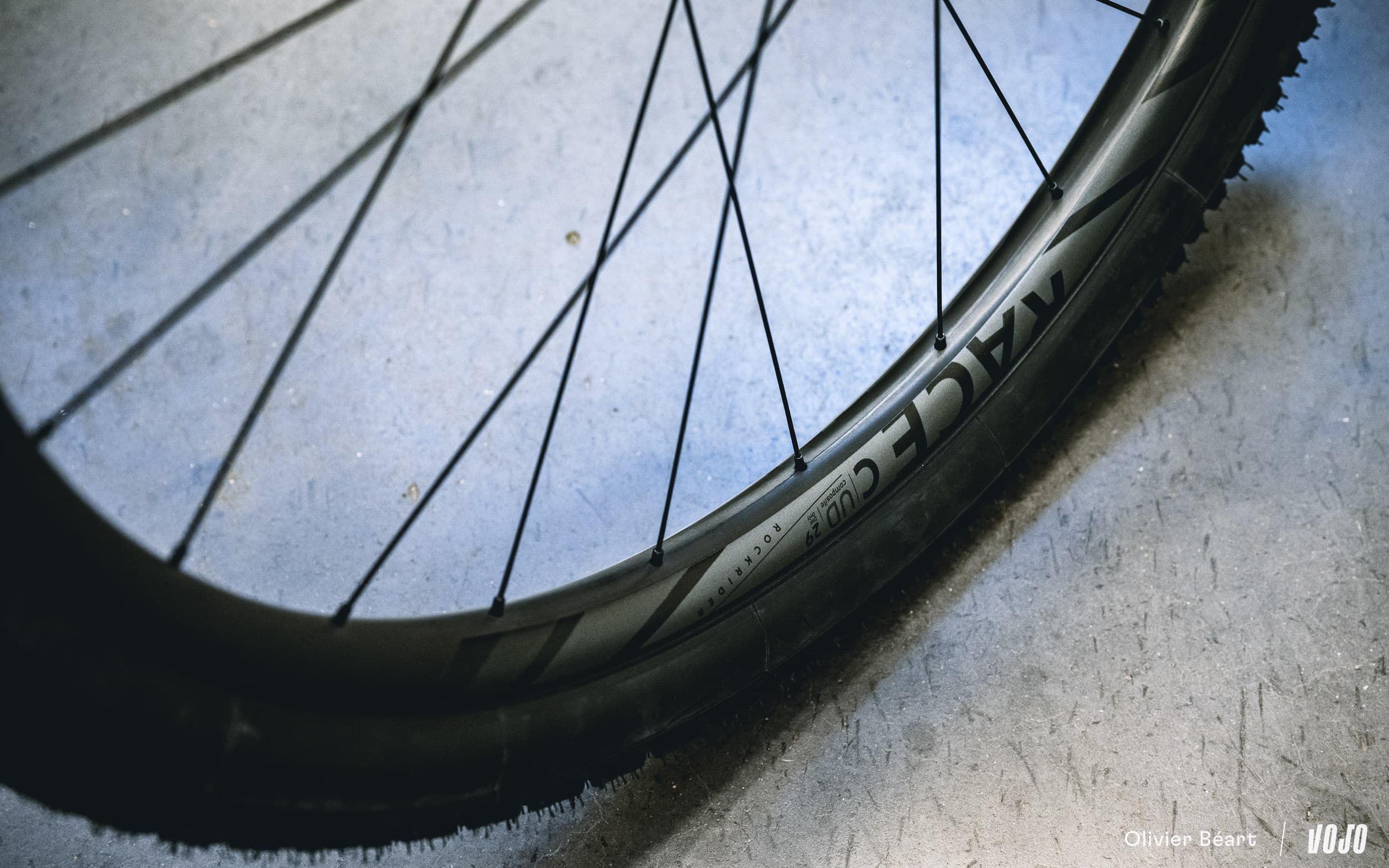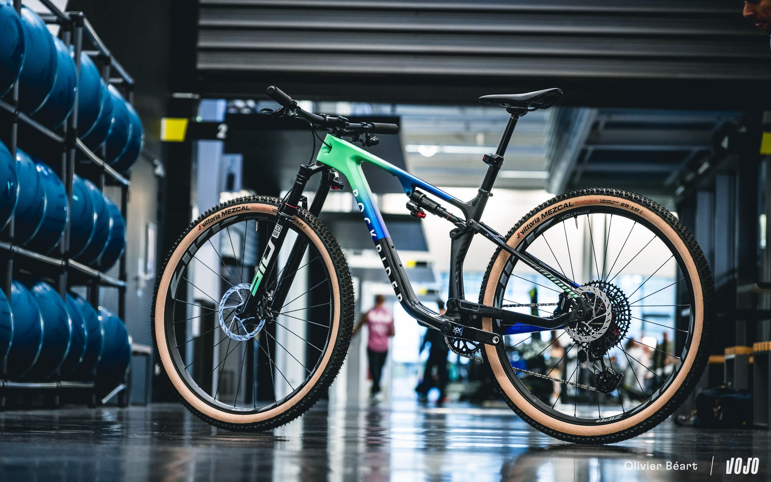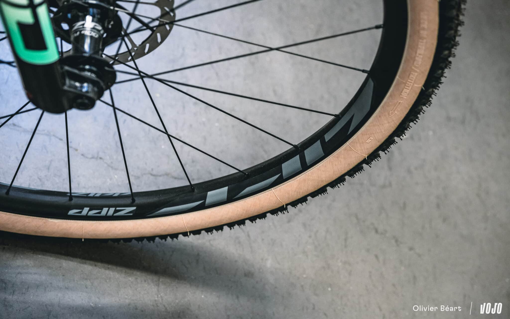 Ces roues sont chaussées de pneus Vittoria Mezcal en 2.25. Le choix de cette section est lié à des questions d’homologation officielle du cadre, mais du 2.4 passe sans problème.