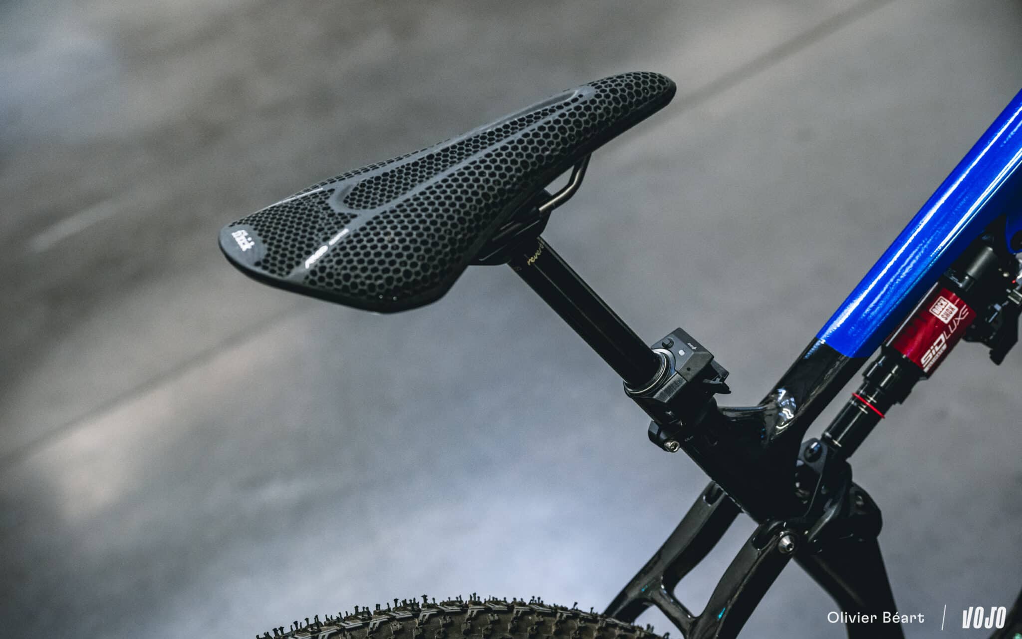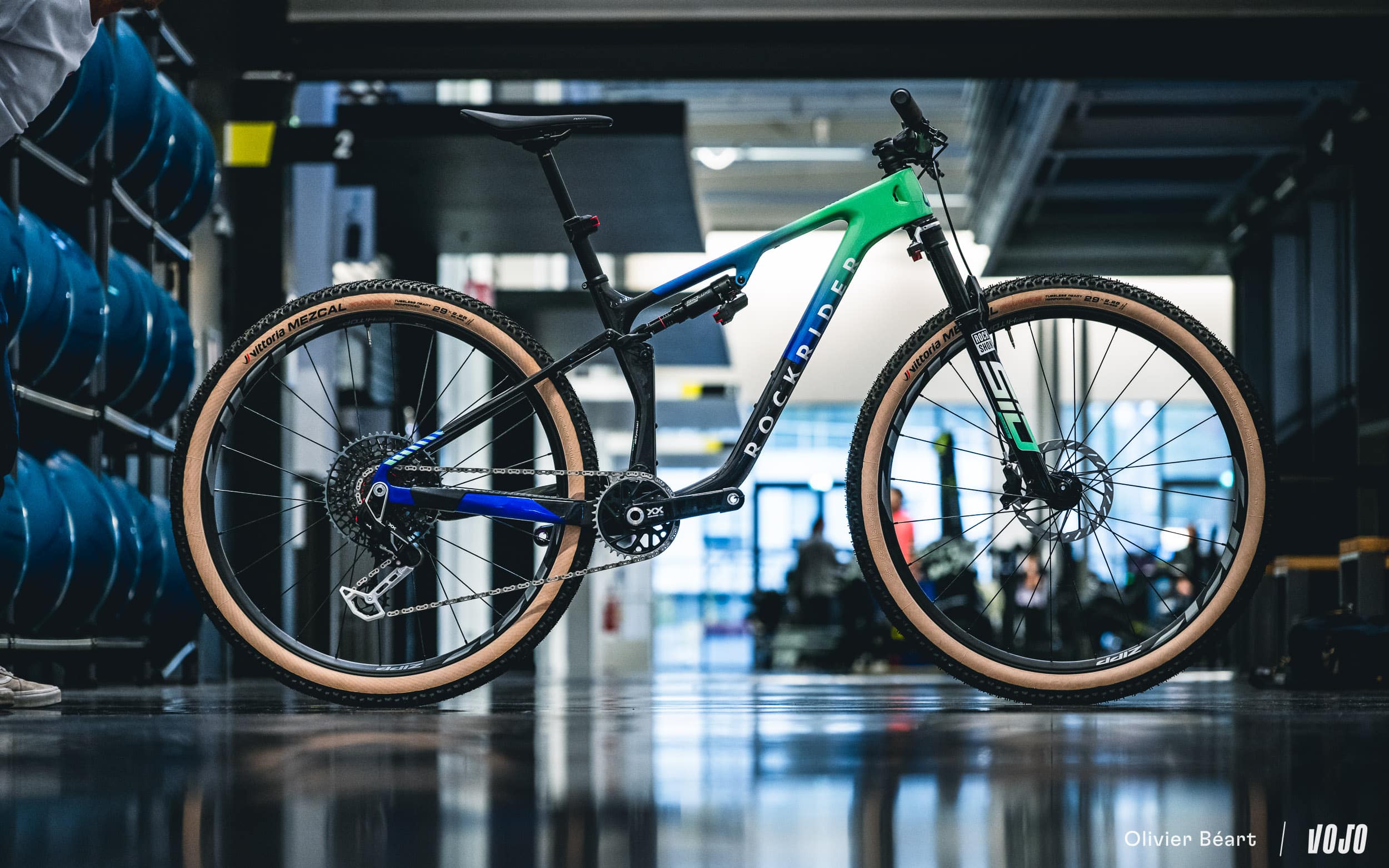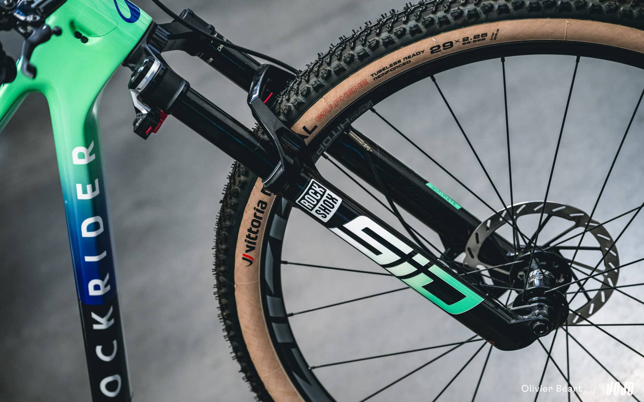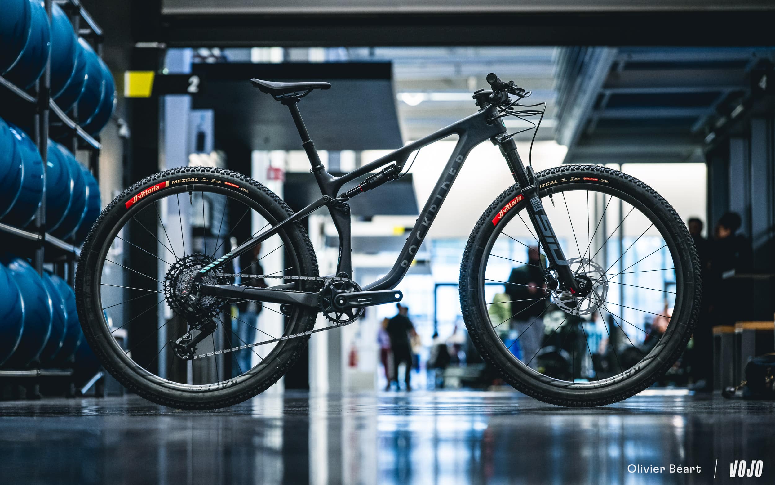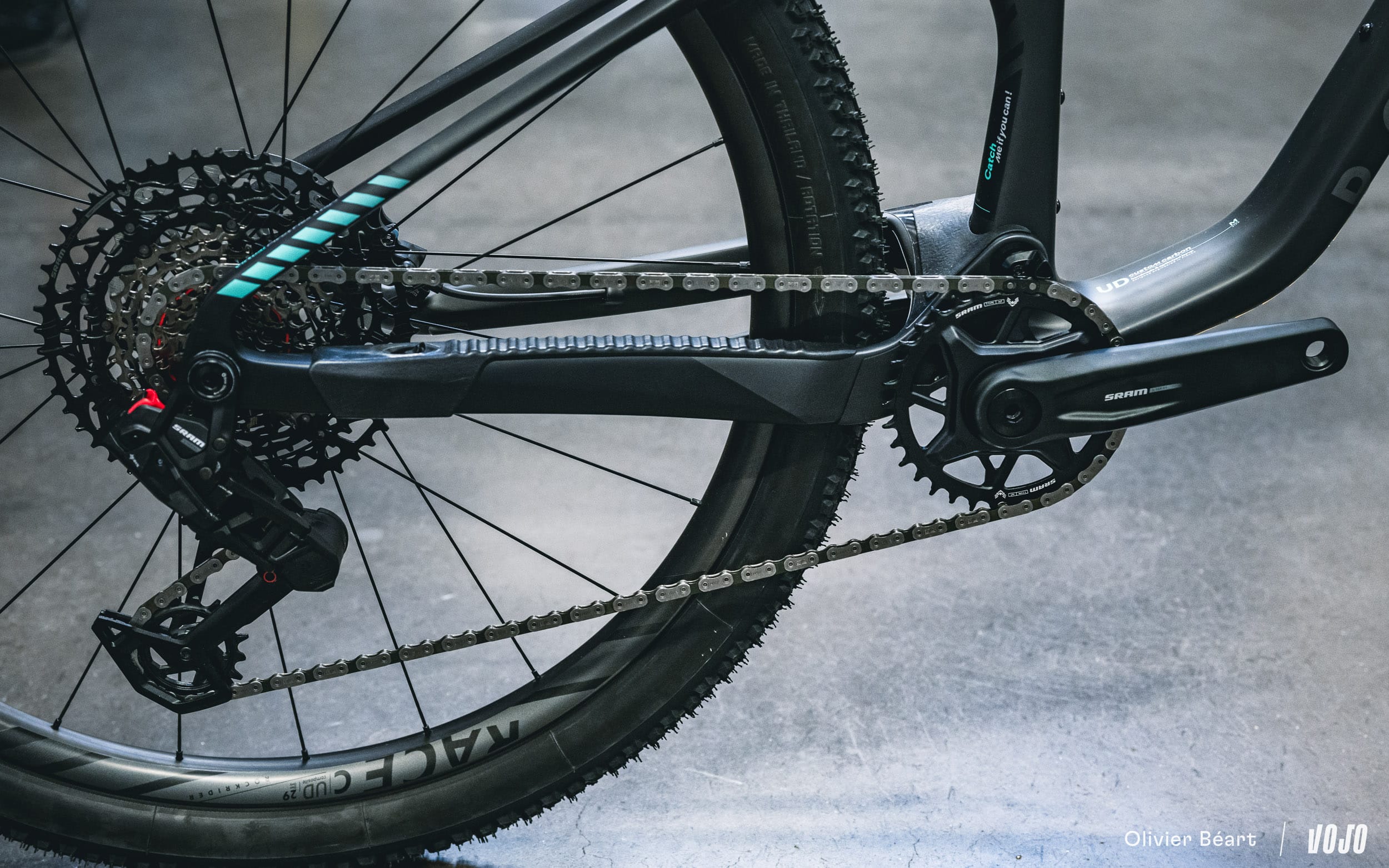 Ces roues sont chaussées de pneus Vittoria Mezcal en 2.25. Le choix de cette section est lié à des questions d’homologation officielle du cadre, mais du 2.4 passe sans problème.