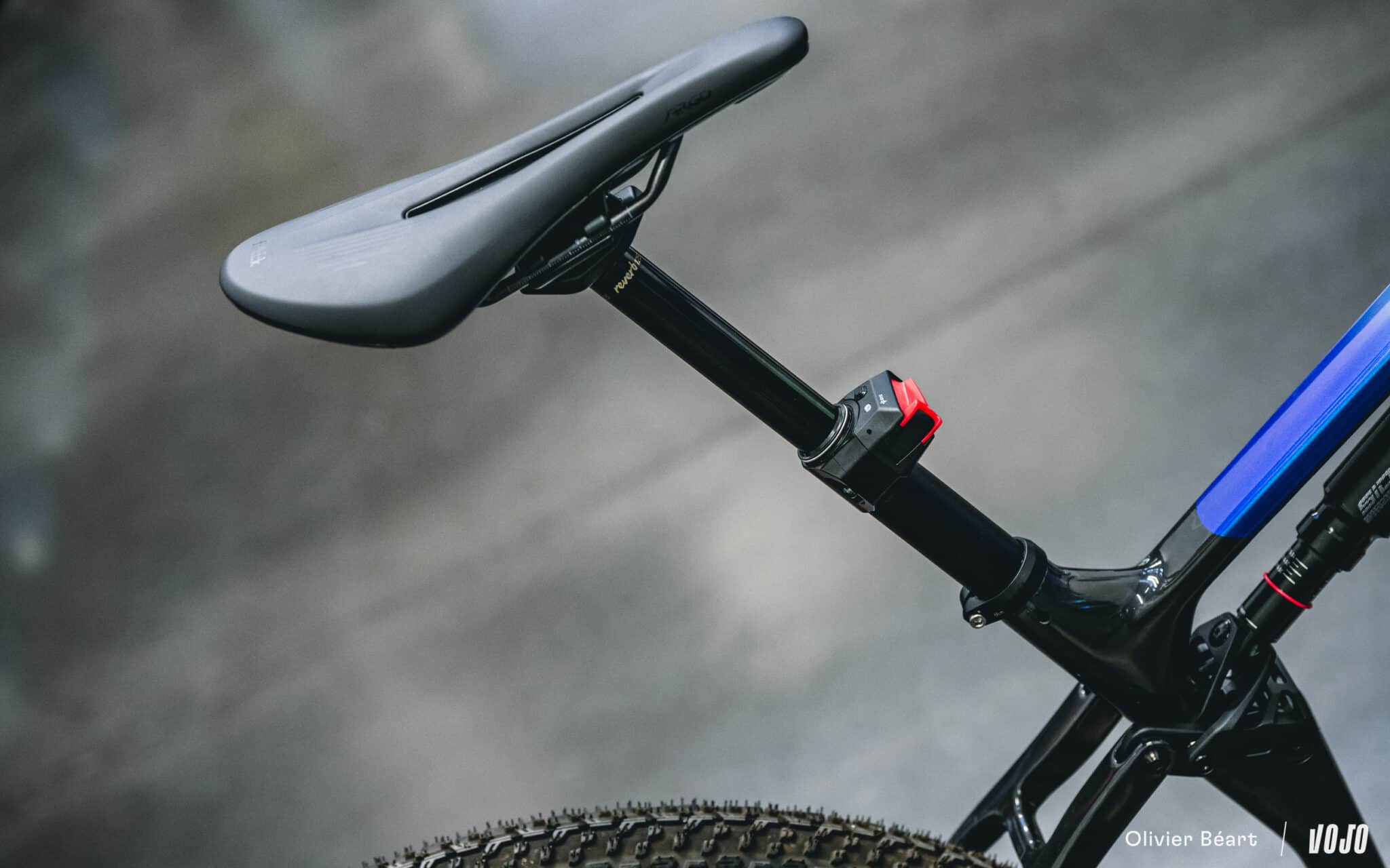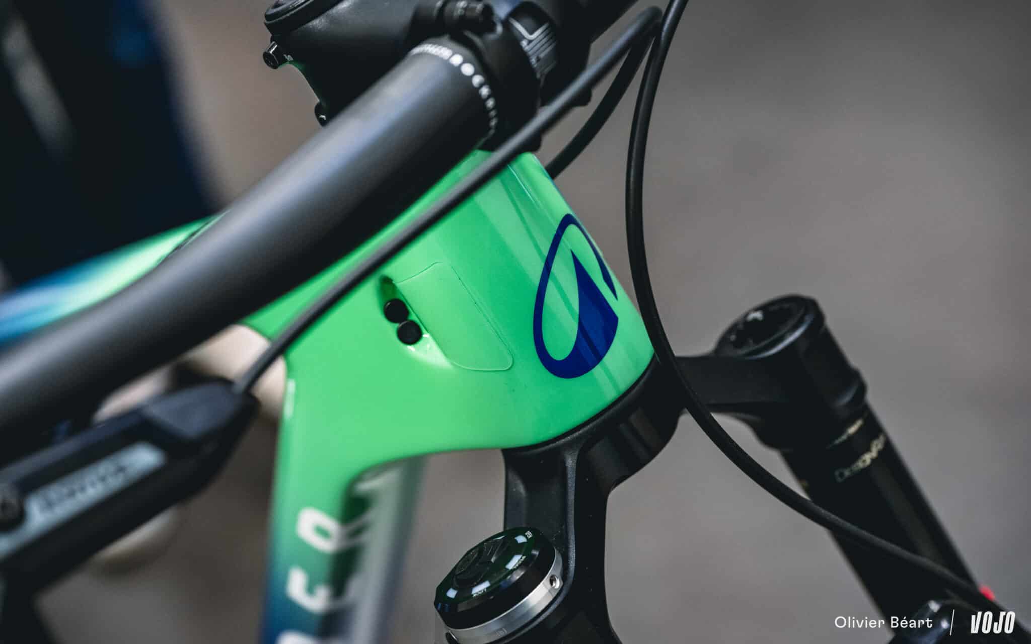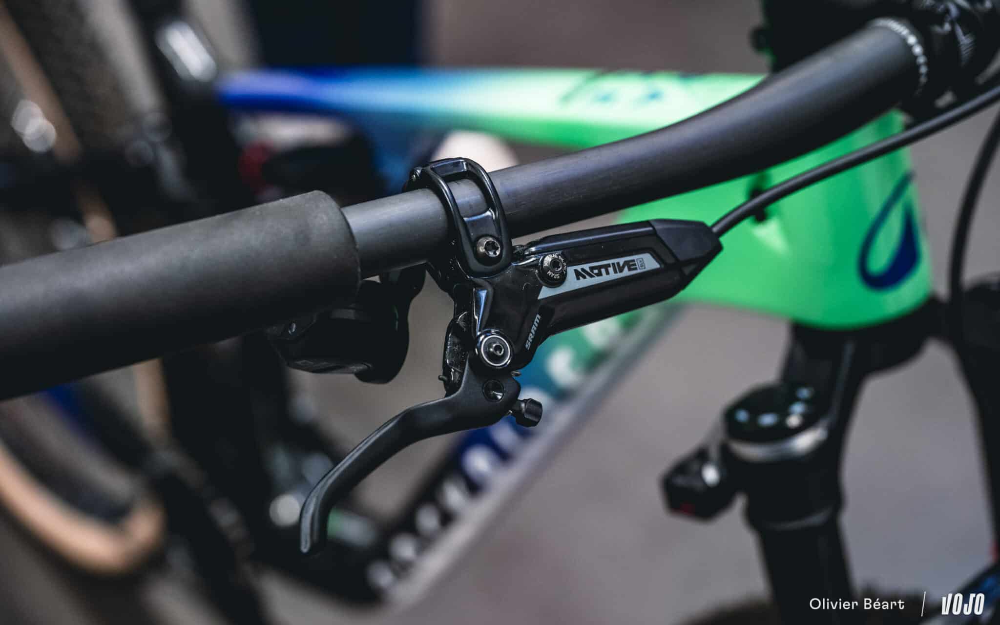 La tige de selle est la RockShox Reverb AXS avec selle Fizik 3D et le poste de pilotage ne sera pas un Darimo comme le team, mais un cockpit intégré tout carbone de chez Ursus (non présent sur nos photos). Les freins sont les Sram Motive Ultimate.
