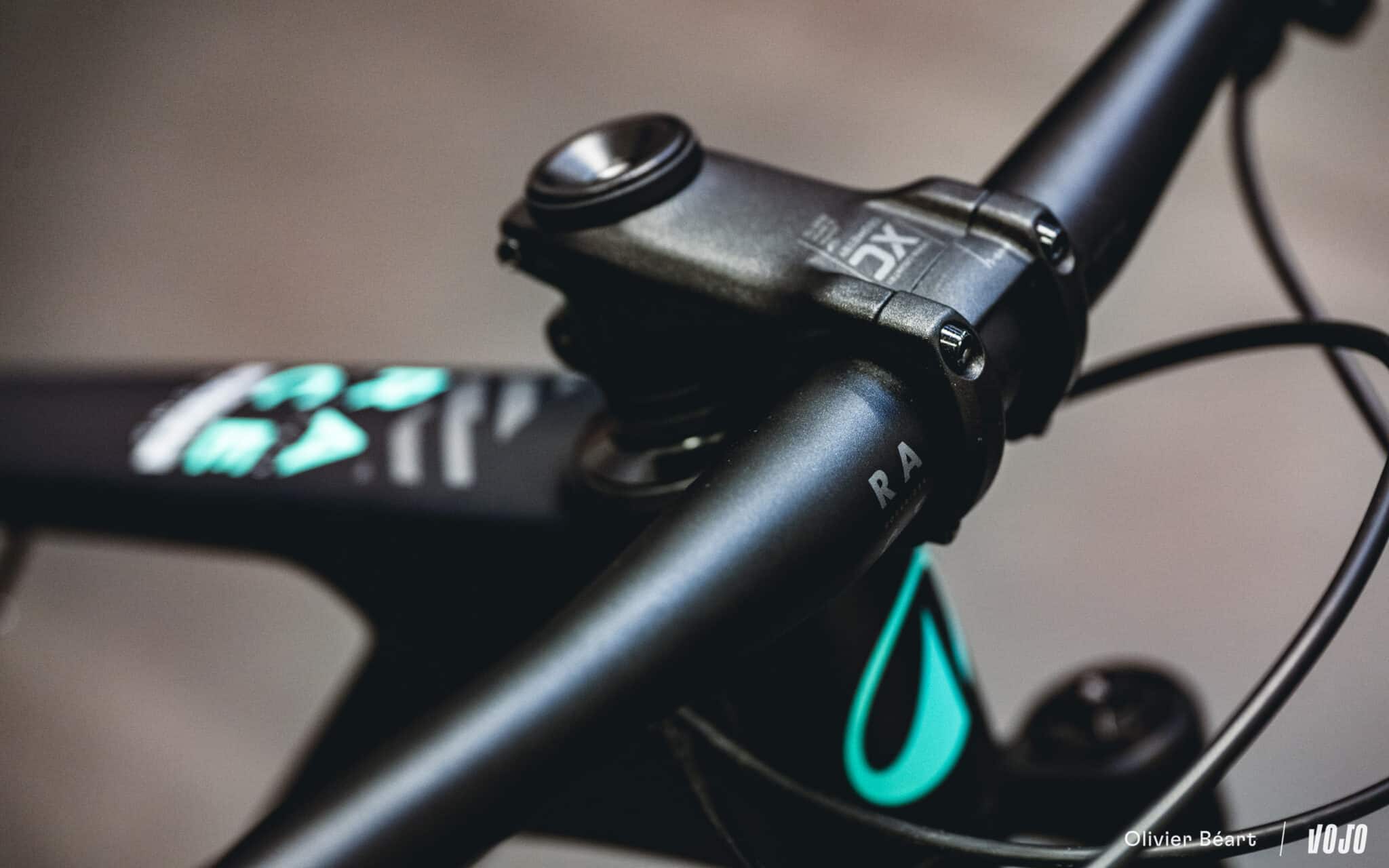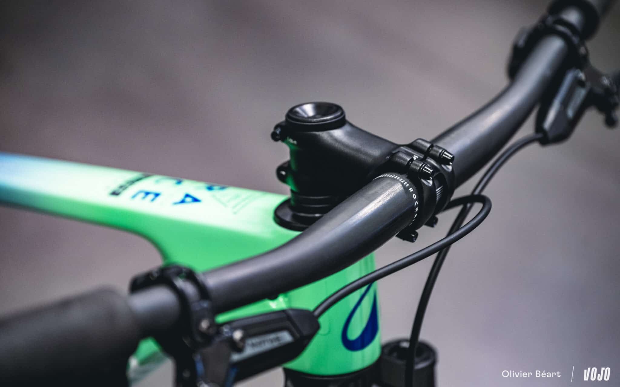 Les freins sont des Sram Motive en version Silver, la tige de selle est la RockShox Reverb AXS et le poste de pilotage est signé Rockrider avec un cintre carbone maison.