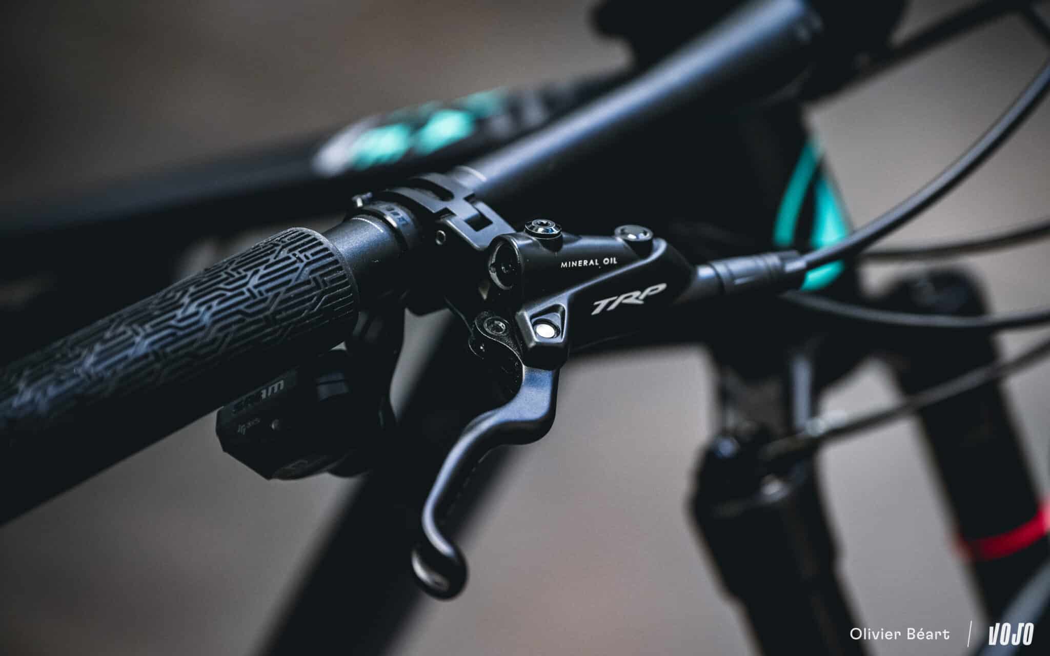 Pour le reste, le poste de pilotage est en alu, la tige de selle télescopique est toujours bien présente de série et les freins proviennent de chez TRP.