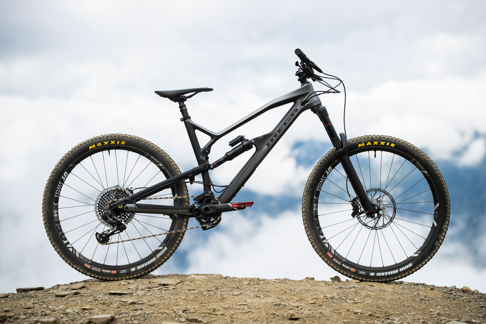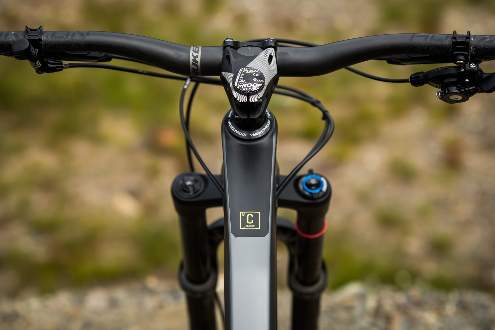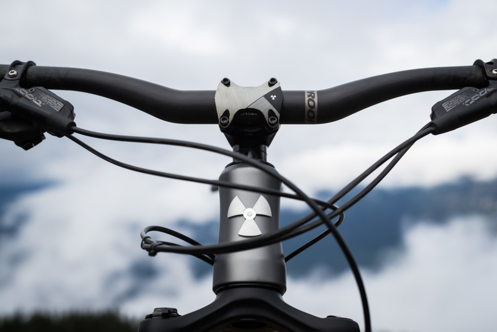 La principale nouveauté, qui n’est plus vraiment une surprise depuis qu’on a vu Sam Hill au guidon d’un prototype très abouti depuis l’EWS Ireland, mais aussi sur les championnats du Monde de DH où il a pris la 6e place, c’est l’apparition d’une version carbone baptisée Nukeproof 275c.
